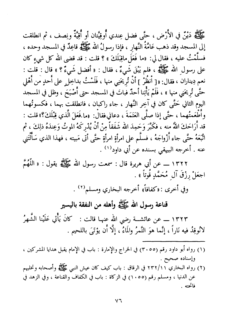 (¬2) رواه البخاري 11/ 232 في الرقاق: باب كيف كان عيش النبي - صلى الله عليه وسلم - وأصحابه وتخليهم عن الدنيا، ومسلم رقم (1055) في الزكاة: باب في الكفاف والقناعة، وفي الزهد في فاتحته.