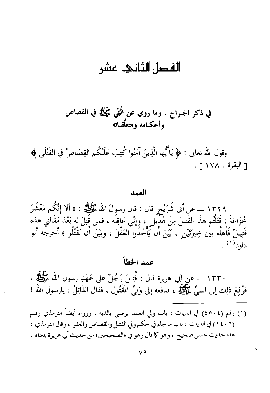 الفصل الثاني عشر: في ذكر الجراح، وما روي عن النَّبيِّ - صلى الله عليه وسلم - في القصاص وأحكامه ومتعلَّقاته