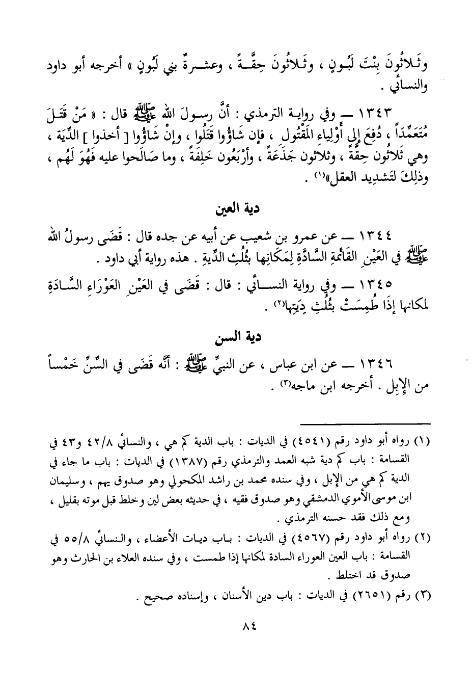 1344 - عن عمرو بن شعيب عن أبيه عن جده قال: قَضَى رسولُ الله - صلى الله عليه وسلم - في العَيْنِ القَائمةِ السَّادَّةِ لِمَكَانِها بثُلُثِ الدِّيةِ. هذه رواية أبي داود.