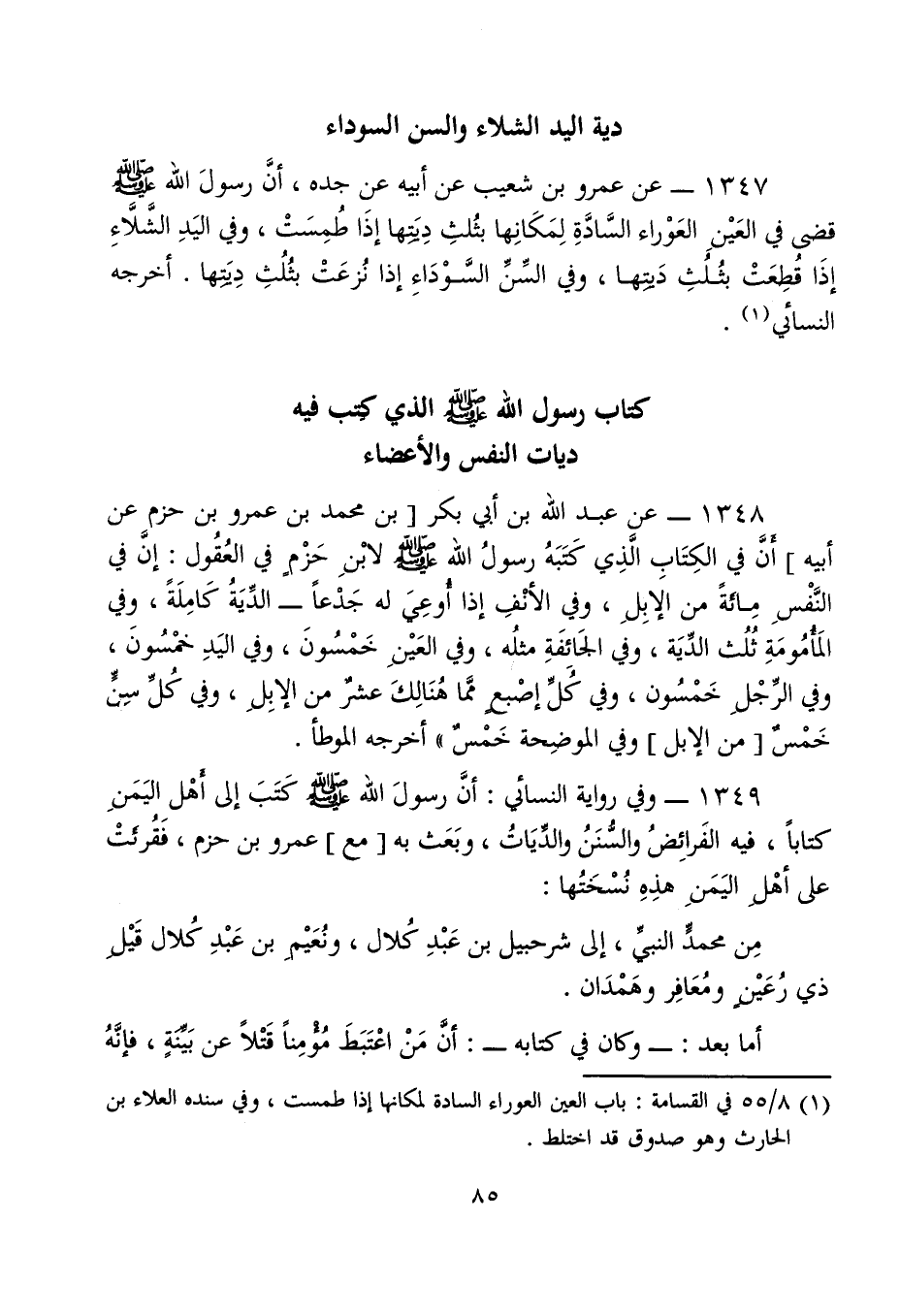 1348 - عن عبد الله بن أبي بكر [بن محمد بن عمرو بن حزم عن أبيه] أَنَّ في الكِتَابِ الَّذِي كَتَبَهُ رسولُ الله - صلى الله عليه وسلم - لابْنِ حَزْمٍ في العُقُول: إنَّ في النَّفْسِ مِائَةً من الإبِلِ، وفي الأنْفِ إذا أُوعِيَ له جَدْعًا - الدِّيَةُ كَامِلَةً، وفي المَأُمُومَةِ ثُلُث الدِّيَة، وفي الجَائِفَةِ مثلُه، وفي العَيْنِ خَمْسُونَ، وفي اليَدِ خمْسُونَ، وفي الرِّجْلِ خَمْسُون، وفي كُلِّ إصْبعٍ ممَّا هُنَالِكَ عشرٌ من الإبِلِ، وفي كُلِّ سِنٍّ خَمْسٌ [من الإبل] وفي الموضِحة خَمْسٌ" أخرجه الموطأ.