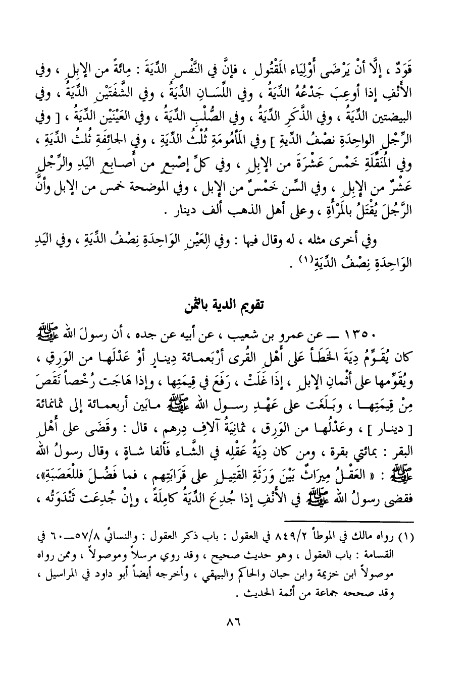(¬1) رواه مالك في الموطأ 2/ 849 في العقول: باب ذكر العقول: والنسائي 8/ 57 - 60 في القسامة: باب العقول، وهو حديث صحيح، وقد روي مرسلًا وموصولًا، وممن رواه موصولًا ابن خزيمة وابن حبان والحاكم والبيهقي، وأخرجه أيضًا أبو داود في المراسيل، وقد صححه جماعة من أئمة الحديث.