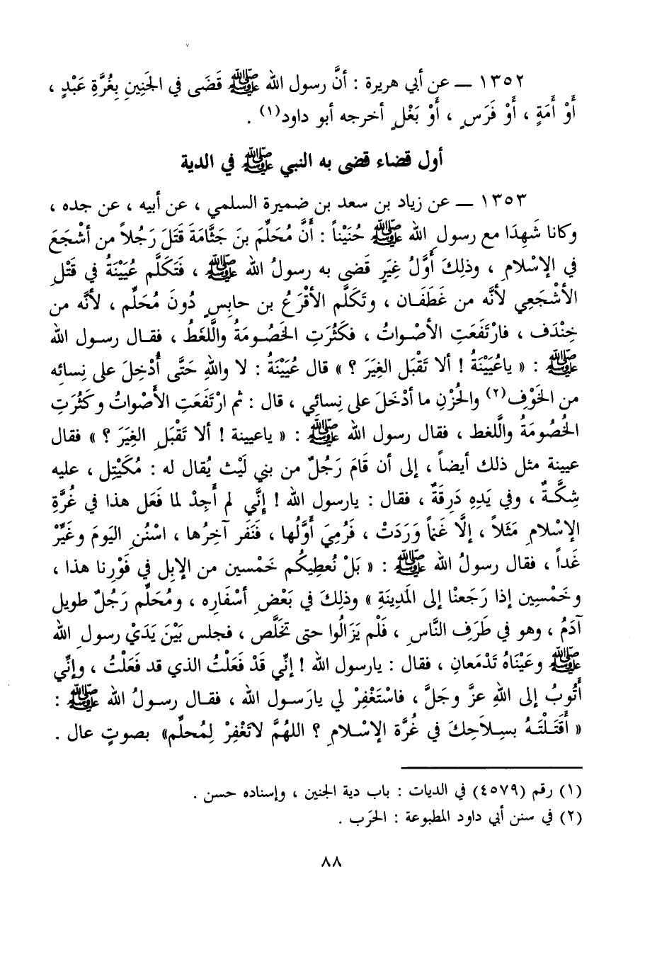 1352 - عن أبي هريرة: أنَّ رسول الله - صلى الله عليه وسلم - قَضَى في الجَنِينِ بِغُرَّةِ عَبْدٍ، أَوْ أَمَةٍ، أَوْ فَرَسٍ، أوْ بَغْلٍ أخرجه أبو داود (¬1).