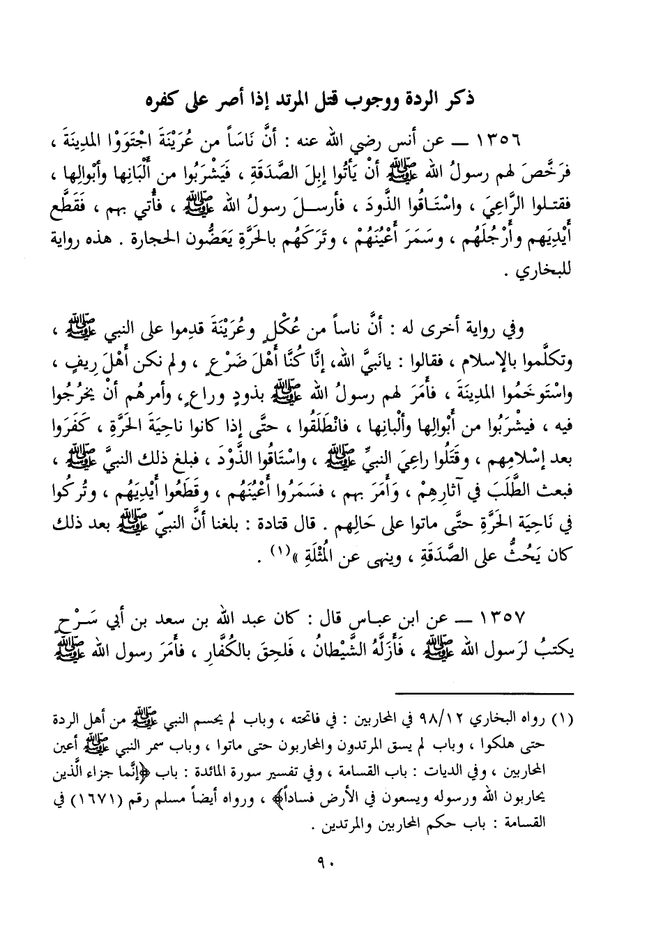 (¬1) رواه البخاري 12/ 98 في المحاربين: في فاتحته، وباب لم يحسم النبي - صلى الله عليه وسلم - من أهل الردة حتى هلكوا، وباب لم يسق المرتدون والمحاربون حتى ماتوا، وباب سمر النبي - صلى الله عليه وسلم - أعين المحاربين، وفي الديات: باب القسامة، وفي تفسير سورة المائدة: باب {إِنَّمَا جَزَاءُ الَّذِينَ يُحَارِبُونَ اللَّهَ وَرَسُولَهُ وَيَسْعَوْنَ فِي الْأَرْضِ فَسَادًا}، ورواه أيضًا مسلم رقم (1671) في القسامة: باب حكم المحاربين والمرتدين.