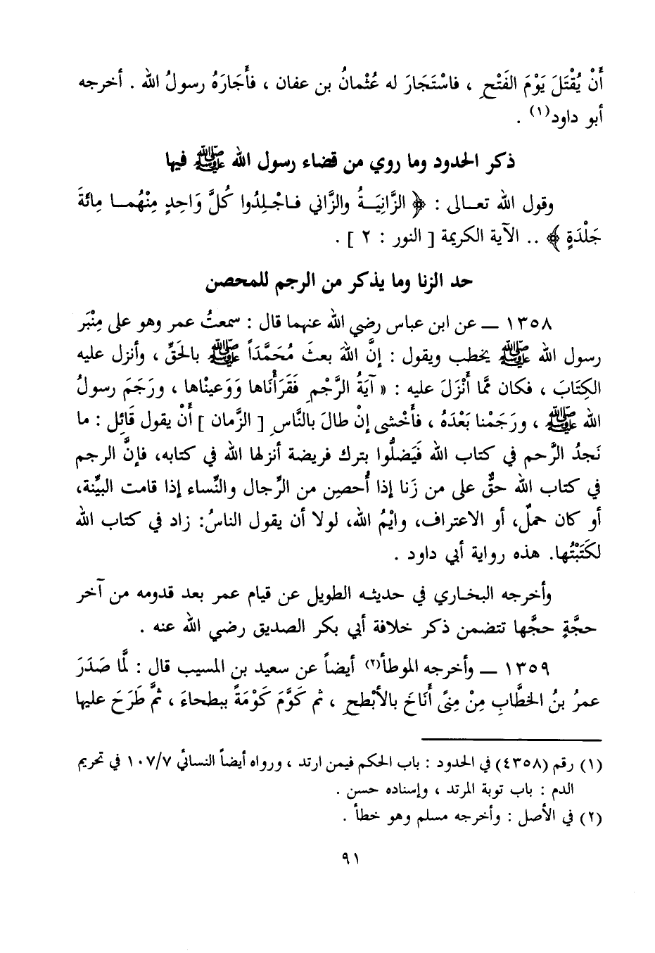 1358 - عن ابن عباس رضي الله عنهما قال: سمعتُ عمر وهو على مِنْبَر رسول الله - صلى الله عليه وسلم - يخطب ويقول: إنَّ الله بعثَ مُحَمَّدًا - صلى الله عليه وسلم - بالحَقِّ، وأنزل عليه الكِتَابَ، فكان ممَّا أَنْزَلَ عليه: "آيَةُ الرَّجْمِ فَقَرَأْنَاها وَوَعينْاها، ورَجَمَ رسولُ الله - صلى الله عليه وسلم -، ورَجَمْنا بَعْدَهُ، فأَخْشى إنْ طالَ بالنَّاسِ [الزَّمان] أَنْ يقول قَائِل: ما نَجدُ الرجم في كتاب الله فَيَضلُّوا بترك فريضة أنزلها الله في كتابه، فإنَّ الرجم في كتاب الله حقٌّ على من زَنا إذا أُحصِن من الرِّجال والنِّساء إذا قامت البيِّنة، أو كان حملٌ، أو الاعتراف، وايْمُ الله، لولا أن يقول الناسُ: زاد في كتاب الله لكَتَبْتُها. هذه رواية أبي داود.