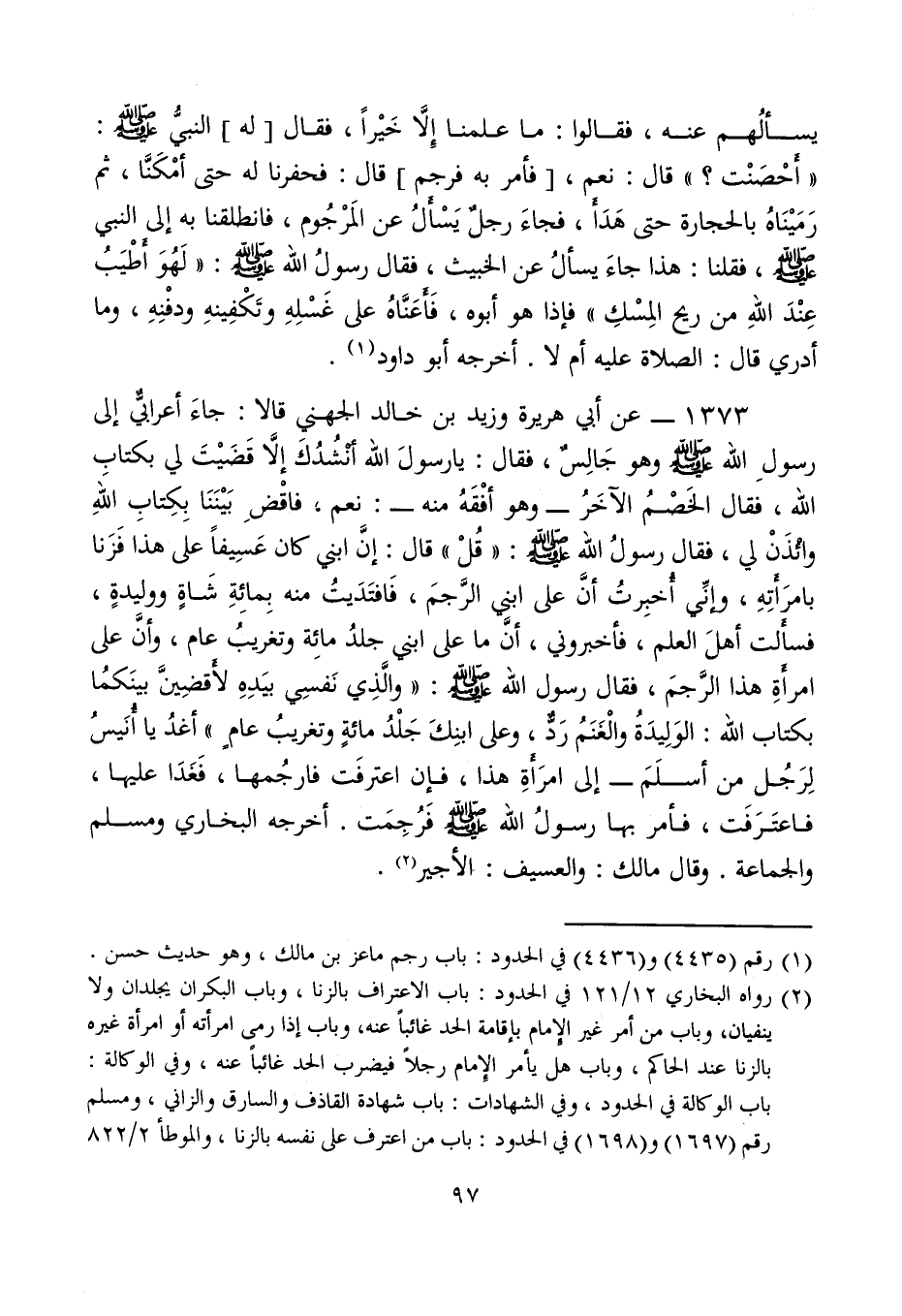 1373 - عن أبي هريرة وزيد بن خالد الجهني قالا: جاءَ أعرابيٌّ إلى رسولِ الله - صلى الله عليه وسلم - وهو جَالِسٌ، فقال: يا رسولَ الله أنْشُدُكَ إلَّا قَضَيْتَ لي بكتابِ الله، فقال الخَصْمُ الآخَرُ - وهو أفْقَهُ منه -: نعم، فاقْضِ بَيْنَنَا بِكِتابِ اللهِ وائْذَنْ لي، فقال رسولُ الله - صلى الله عليه وسلم -: "قُلْ" قال: إنَّ ابني كان عَسِيفًا على هذا فَزَنا بامرَأَتِهِ، وإنِّي أُخبِرتُ أنَّ على ابني الرَّجمَ، فَافتَدَيتُ منه بِمائةِ شَاةٍ ووليدةٍ، فسأَلت أهلَ العلم، فأخبروني، أنَّ ما على ابني جلدُ مائة وتغريبُ عام، وأنَّ على امرأَةِ هذا الرَّجمَ، فقال رسول الله - صلى الله عليه وسلم -: "والَّذِي نَفسِي بيَدِهِ لأقضِينَّ بينَكُما بكتاب الله: الوَلِيدَةُ والْغَنَمُ رَدٌّ، وعلى ابنِكَ جَلْدُ مائةٍ وتغريبُ عامٍ" أغدُ يا أُنَيسُ لِرَجُل من أسلَمَ - إلى امرَأَةِ هذا، فإن اعترفَت فارجُمها، فَغَدَا عليها، فاعتَرَفَت، فأمر بها رسولُ الله - صلى الله عليه وسلم - فَرُجِمَت. أخرجه البخاري ومسلم والجماعة. وقال مالك: والعسيف: الأجير (¬2).