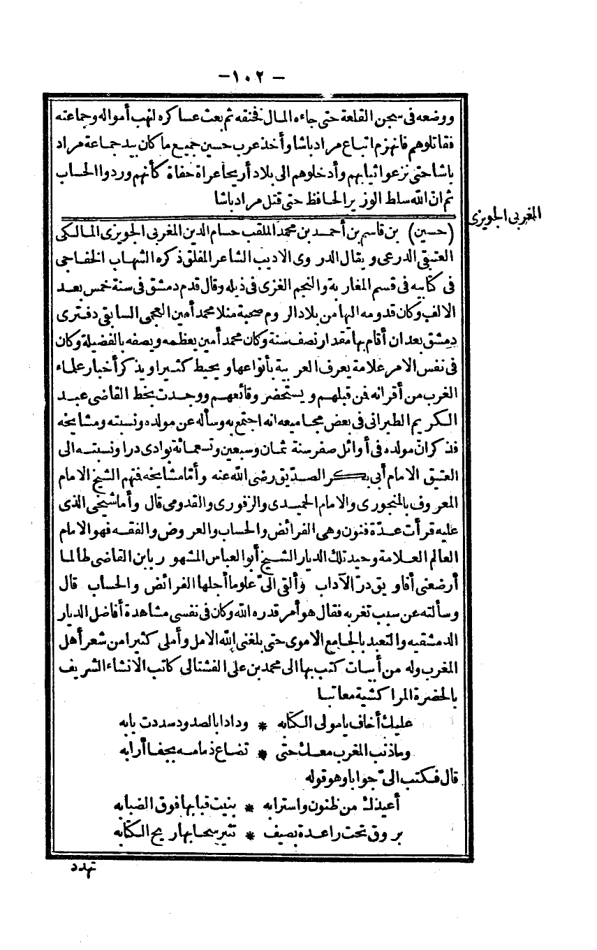 حُسَيْن بن قَاسم بن أَحْمد بن مُحَمَّد الملقب حسام الدّين المغربي الجويزي الْمَالِكِي العتيقي الدرعي يُقَال الدروي الأديب الشَّاعِر المفلق ذكره الشهَاب الخفاجي فِي كِتَابيه فِي قسم المغاربة والنجم الْغَزِّي فِي ذيله وَقَالَ قدم دمشق فِي سنة خمس بعد الْألف وَكَانَ قدومه إِلَيْهَا من بِلَاد الرّوم صُحْبَة منلا مُحَمَّد أَمِين العجمي السابقي دفتري دمشق بعد أَن أَقَامَ بهَا مِقْدَار نصف سنة وَكَانَ مُحَمَّد أَمِين يعظمه ويصفه بالفضيلة وَكَانَ فِي نفس الْأَمر عَلامَة يعرف الْعَرَبيَّة بأنواعها ويحيط كثيرا وَيذكر أَخْبَار عُلَمَاء الغرب من أقرانه فَمن قبلهم ويستحضر وقائعهم وَوجدت بِخَط القَاضِي عبد الْكَرِيم الطَّبَرَانِيّ فِي بعض مجاميعه أَنه اجْتمع بِهِ وَسَأَلَهُ عَن مولده ونسبته ومشايخه فَذكر أَن مولده فِي أَوَائِل صفر سنة ثَمَان وَسبعين وَتِسْعمِائَة بوادي درا ونسبته إِلَى الْعَتِيق الإِمَام أبي بكر الصّديق رَضِي الله عَنهُ وَأما مشايخه فَمنهمْ الشَّيْخ الإِمَام الْمَعْرُوف بالنجوري وَالْإِمَام الْحميدِي والزفوري والقدومي قَالَ وَأما شَيْخي الَّذِي عَلَيْهِ قَرَأت عدَّة فنون وَهِي الْفَرَائِض والحساب وَالْعرُوض وَالْفِقْه فَهُوَ الإِمَام الْعَالم الْعَلامَة وحيد تِلْكَ الديار الشَّيْخ أَبُو الْعَبَّاس الْمَشْهُور بِابْن القَاضِي طالما أرضعني أفاويق در الْآدَاب وَألقى إِلَيّ علوما أجلهَا الْفَرَائِض والحساب قَالَ وَسَأَلته عَن سَبَب تغربه فَقَالَ هُوَ أَمر قدره الله وَكَانَ فِي نَفسِي مُشَاهدَة أفاضل الديار الدمشقية والتعبد بالجامع الْأمَوِي حَتَّى بَلغنِي الله الأمل وأملى كثيرا من شعر أهل الْمغرب وَله من أَبْيَات كتب بهَا إِلَى مُحَمَّد بن عَليّ الفشتالي كَاتب الْإِنْشَاء الشريف بالحضرة المراكشية معاتبا