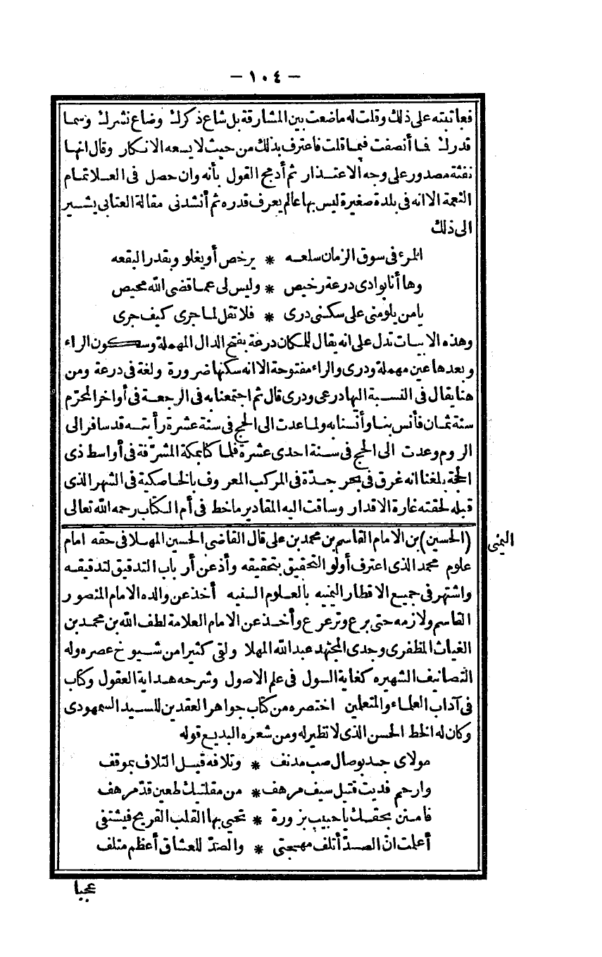 الْحُسَيْن بن الإِمَام الْقَاسِم بن مُحَمَّد بن عَليّ قَالَ القَاضِي الْحُسَيْن المهلا فِي حَقه إِمَام عُلُوم مُحَمَّد الَّذِي اعْترف أولو التَّحْقِيق بتحقيقه وأذعن أَرْبَاب التدقيق لتدقيقه واشتهر فِي جَمِيع الأقطار اليمنية بالعلوم السّنيَّة أَخذ عَن وَالِده الإِمَام الْمَنْصُور الْقَاسِم ولازمه حَتَّى برع وترعرع وَأخذ عَن الإِمَام الْعَلامَة لطف الله بن مُحَمَّد بن الغياث المظفري وجدي الْمُجْتَهد عبد الله المهلا وَلَقي كثيرا من شُيُوخ عصره وَله التصانيف الشهيرة كغاية السول فِي علم الْأُصُول وَشَرحه هِدَايَة الْعُقُول وَكتاب فِي آدَاب الْعلمَاء والمتعلمين اخْتَصَرَهُ من كتاب جَوَاهِر الْعقْدَيْنِ للسَّيِّد السمهودي وَكَانَ لَهُ الْخط الْحسن الَّذِي لَا نَظِير لَهُ وَمن شعره البديع قَوْله