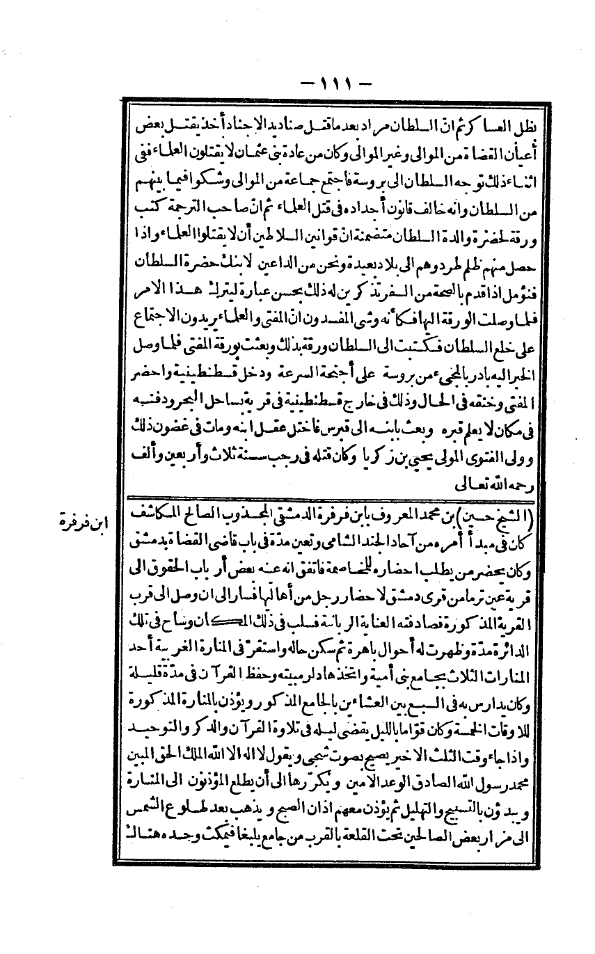 الشَّيْخ حُسَيْن بن مُحَمَّد الْمَعْرُوف بِابْن فرفرة الدِّمَشْقِي المجذوب الصَّالح المكاشف كَانَ فِي مبدأ أمره من آحَاد الْجند الشَّامي وَتعين مُدَّة فِي بَاب قَاضِي الْقُضَاة بِدِمَشْق وَكَانَ يحضر من يطْلب إِحْضَاره للمخاصمة فاتفق أَنه عينه بعض أَرْبَاب الْحُقُوق إِلَى قَرْيَة عين ترما من قرى دمشق لاحضار رجل من أهاليها فَسَار إِلَى أَن وصل إِلَى قرب الْقرْيَة الْمَذْكُورَة فصادفته الْعِنَايَة الربانية فسلب فِي ذَلِك الْمَكَان وساح فِي تِلْكَ الدائرة مُدَّة وَظَهَرت لَهُ أَحْوَال باهرة ثمَّ سكن حَاله وَاسْتقر فِي المنارة الغربية أحد المنارات الثَّلَاث بِجَامِع بني أُميَّة واتخذها دَار مبيته وَحفظ الْقُرْآن فِي مُدَّة قَليلَة وَكَانَ يدارس بِهِ فِي السَّبع بَين العشاءين بالجامع الْمَذْكُور وَيُؤذن بالمنارة الْمَذْكُورَة للأوقات الْخَمْسَة وَكَانَ قواما بِاللَّيْلِ يقْضِي ليله فِي تِلَاوَة الْقُرْآن وَالذكر والتوحيد وَإِذا جَاءَ وَقت الثُّلُث الْأَخير يَصِيح بِصَوْت شجي وَيَقُول لَا إِلَه إِلَّا الله الْملك الْحق الْمُبين مُحَمَّد رَسُول الله الصَّادِق الْوَعْد الْأمين ويكررها إِلَى أَن يطلع المؤذنون إِلَى المنارة ويبدؤون بالتسبيح والتهليل ثمَّ يُؤذن مَعَهم أَذَان الصُّبْح وَيذْهب بعد طُلُوع الشَّمْس إِلَى مَزَار بعض الصَّالِحين تَحت القلعة بِالْقربِ من جَامع يلبغا فيمكث وَحده هُنَاكَ