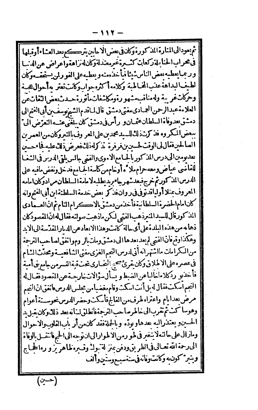 ثمَّ يعود إِلَى المنارة الْمَذْكُورَة وَكَانَ فِي بعض الْأَحَايِين يتركع بعد الْعشَاء أَو قبلهَا فِي محراب الْحَنَابِلَة رَكْعَات كثيرات غير معتدلة وَكَانَ لَهُ نزاهة وإعراض عَن الدُّنْيَا وَرُبمَا يُعْطِيهِ بعض النَّاس شَيْئا فَيَأْخُذ مِنْهُ وَيُعْطِيه على الْفَوْر لمن يسْتَحقّهُ وَكَانَ لطيف البداهة عذب المخاطبة وَكَلَامه أَكْثَره جَوَاب وَكَانَت تعتريه أَحْوَال عَجِيبَة وحركات غَرِيبَة وَله مَنَاقِب مَشْهُورَة ومكاشفات مأثورة حدث بعض الثِّقَات عَن الْعَلامَة عبد الرَّحْمَن الْعِمَادِيّ مفتي دمشق قَالَ لما قدم الشَّيْخ يُوسُف بن أبي الْفَتْح إِلَى دمشق بعد وَفَاة السُّلْطَان عُثْمَان وَرَأس فِي دمشق كَانَ يبلغنِي عَنهُ التَّعَرُّض إِلَيّ بِبَعْض الْمَكْرُوه فَذكرت ذَلِك للسَّيِّد مُحَمَّد بن عَليّ الْمَعْرُوف بالمنير وَكَانَ من المعمر بن الصَّالِحين فَقَالَ لي الْوَقْت لحسين بن فرفرة تذكر لَهُ ذَلِك فَعرض ذَلِك عَلَيْهِ فجَاء حُسَيْن بعد يَوْمَيْنِ إِلَى درس الْمَذْكُور بالجامع الْأمَوِي والفتحي جَالس يلقِي الدَّرْس فِي الشفا للْقَاضِي عِيَاض وَمَعَهُ حرَام ملأَهُ أوخام من كناسَة الْجَامِع فَدخل ونفض مَا فِيهِ على الدَّرْس الْمَذْكُور ثمَّ خرج فَبعد شهر جَاءَ بريد يَطْلُبهُ لأمامة السُّلْطَان مُرَاد وَكَانَ أَمَامه الْمَعْرُوف بمنلا أوليا قد توفّي فِي روان فَذكر بعض خدمَة السلطنة ابْن أبي الْفَتْح وَأَنه كَانَ أَمَام الحضرة السُّلْطَانِيَّة فَأخذ من دمشق بالإكرام التَّام ثمَّ أَن الْعِمَادِيّ الْمَذْكُور قَالَ للسَّيِّد الْمُنِير ذهب الفتحي لَكِن مَا ذهبت صولته فَقَالَ لَهُ أَن الْمَقْصُود كَانَ ذَهَابه من هَذِه الْبَلدة على أَي حَالَة كَانَت وَهَذَا الأبعاد عَن الديار المقدسة إِلَى الْأَبَد وَهَكَذَا أوقع فَإِن الفتحي لم يعد بعْدهَا إِلَى دمشق وَمَات بالروم وَاتفقَ لصَاحب التَّرْجَمَة من الكرامات مَا اشْتهر انه أَتَى لدرس النَّجْم الغزى مفتي الشَّافِعِيَّة مُحدث الشَّام فِي عصره على الْإِطْلَاق وَكَانَ يقرئ صَحِيح البُخَارِيّ تَحت قبَّة النسْر من جَامع بني أُميَّة فَأخذ يُورد كلَاما خَالِيا عَن الضَّبْط وَيسْأل سُؤَالَات خَارِجَة عَن الْمَقْصُود فَقَالَ لَهُ النَّجْم اسْكُتْ فَقَالَ لَهُ بل أَنْت اسْكُتْ وَقَامَ مغضبا من مجْلِس الدَّرْس فاتفق أَن النَّجْم مرض بعد أَيَّام واعتراه طرف من الفالج فأسكت وَحضر الدَّرْس نَحْو سِتَّة أَعْوَام وَهُوَ سَاكِت ثمَّ تقرب إِلَى خاطر صَاحب التَّرْجَمَة فَانْطَلق لِسَانه بعد ذَلِك وَكَانَ يقبل يَد الْحُسَيْن وَيعْتَذر إِلَيْهِ بعْدهَا يوده وَبِالْجُمْلَةِ فقد كَانَ من أَرْبَاب الْقُلُوب وَالْأَحْوَال وَمَا زَالَ على حَالَته لَا يتَغَيَّر فِي طوره من الأطوار إِلَى أَن توجه إِلَى الْحَج فانتقل بالوفاة إِلَى رَحمَه الله تَعَالَى فِي الطَّرِيق وَدفن بِمَنْزِلَة تَبُوك وقبره ظَاهر يزوره الْحجَّاج ويتبر كَون بِهِ وَكَانَت وَفَاته سنة سبع وَسِتِّينَ ألف