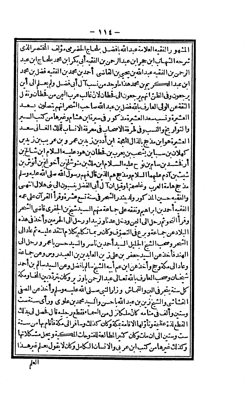 مذْحج هَامة الْعَرَب وغلصمتها وَقيل أَن آل أبي الْفضل ينسبون إِلَى بني هِلَال انْتهى والفقيه خسين الْمَذْكُور ولديندر الشحر فِي سنة تسع عشرَة وَقَرَأَ الْقُرْآن على عَمه الْفَقِيه أَحْمد بن إِبْرَاهِيم وتفقه على جمَاعَة مِنْهُم السَّيِّد شيخ بن الْجفْرِي قَاضِي الشحر وَقَرَأَ النَّحْو ثمَّ رَحل إِلَى الْيمن وَدخل عدنا وزبد أَو رَحل إِلَى الْحَرَمَيْنِ وَأخذ فِي هَذِه الْبِلَاد عَن جمَاعَة وبرع فِي التصوف وَكَانَ رُبمَا تكلم بِكَلَام انتقد عَلَيْهِ ثمَّ عَاد إِلَى الشحر وَصَحب الشَّيْخ الْجَلِيل السَّيِّد أَحْمد بن نَاصِر وَالسَّيِّد حسن با عمر ورحل إِلَى الْهِنْد فَأخذ عَن السَّيِّد جَعْفَر بن عَليّ زين العابدين بن العيدروس وَعَن جمَاعَة وَعَاد إِلَى مَكَّة وَحج وَأخذ عَن ابْن عَم أَبِيه الشَّيْخ سَالم با فضل وَعَن السَّيِّد سَالم بن أَحْمد شَيْخَانِ وَصَحب الْعَارِف بِاللَّه تَعَالَى عبد الرَّحْمَن با وَزِير وَكَانَ يتَرَدَّد بَين المخبا وَمَكَّة كل سنة يتجر فِي البن والقماش وزار النَّبِي