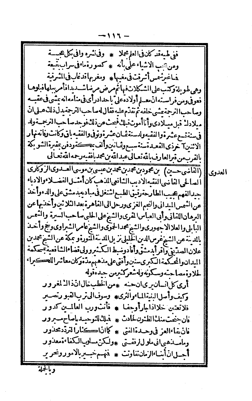 وَهِي طَوِيلَة وَكتب على المشكلات فِيهَا ثمَّ مرض مَرضا شَدِيدا فامر ببلها فبلوها فَعُوفِيَ وَمن فراسته أَن معلم أَوْلَاده عَليّ بأحداد رأى فِي مَنَامه أَنه يمشي فِي عقبه وَصَاحب التَّرْجَمَة يمشي خَلفه ثمَّ تقدم عَلَيْهِ فَقَالَ لَهُ صَاحب التَّرْجَمَة يدل ذَلِك على أَن ميلادك قبل ميلادي وَأَنا أَمُوت قبلك فبحث عَن ذَلِك فَوجدَ صَاحب التَّرْجَمَة ولد فِي سنة تسع عشرَة والفقيه ولد سنة ثَمَان عشرَة وَتُوفِّي والفقيه بَاقٍ وَكَانَت وَفَاته نَهَار الِاثْنَيْنِ آخر ذِي الْقعدَة سنة سبع وَثَمَانِينَ وَألف بِمَكَّة وَدفن بمقبرة الشويكة بِالْقربِ من قبر الْعَارِف بِاللَّه تَعَالَى عبد الله بن مُحَمَّد بافقيه رَحمَه الله تَعَالَى