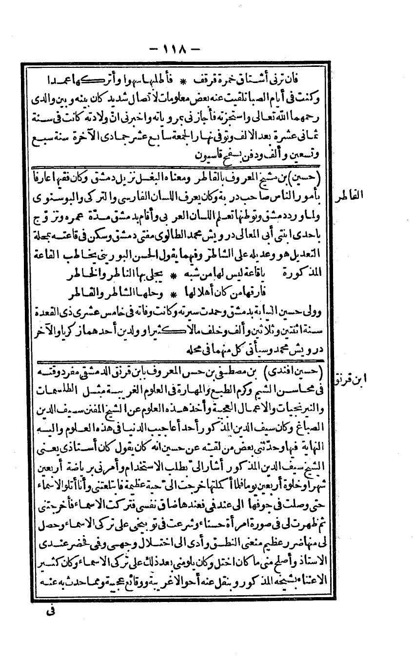 حُسَيْن أَفَنْدِي بن مصطفى بن حسن الْمَعْرُوف بِابْن قرنق الدِّمَشْقِي مُفْرد وقته فِي محَاسِن الشيم وكرم الطَّبْع والمهارة فِي الْعُلُوم الغريبة مثل الطلسمات والنيرنجيات والأعمال العجيبة وَأخذ هَذِه الْعُلُوم عَن الشَّيْخ المفنن سيف الدّين الصّباغ وَكَانَ سيف الدّين الْمَذْكُور أحد أَعَاجِيب الدُّنْيَا فِي هَذِه الْعُلُوم وَإِلَيْهِ النِّهَايَة فِيهَا وحَدثني بعض من لَقيته عَن حسن أَنه كَانَ يَقُول كَانَ أستاذي يَعْنِي الشَّيْخ سيف الدّين الْمَذْكُور أَشَارَ إِلَيّ بِطَلَب الإستخدام وَأَمرَنِي برياضة أَرْبَعِينَ شهرا وخلوة أَرْبَعِينَ يَوْمًا فَلَمَّا أكملتها خرجت إِلَى حَيَّة عَظِيمَة فابتلعتني وَأَنا أتلو الْأَسْمَاء حَتَّى وصلت فِي جوفها إِلَى عِنْد فِي فَعندهَا ضَاقَ فِي نَفسِي فَتركت الْأَسْمَاء فأخرجتني ثمَّ ظَهرت لي فِي صُورَة امْرَأَة حسناء وشرعت فِي توبيخي على تركي الْأَسْمَاء وَحصل لي مِنْهَا ضَرَر عَظِيم مَنَعَنِي النُّطْق وَأدّى إِلَى اختلال وَجْهي وَفِي فَحَضَرَ عِنْدِي الْأُسْتَاذ وَأصْلح مني مَا كَانَ اخْتَلَّ وَكَانَ يلومني بعد ذَلِك على تركي الْأَسْمَاء وَكَانَ كثير الاعتناء بشيخة الْمَذْكُور بِنَقْل عَنهُ احوالا غَرِيبَة ووقائع عَجِيبَة وَمِمَّا حدث بِهِ عَنهُ