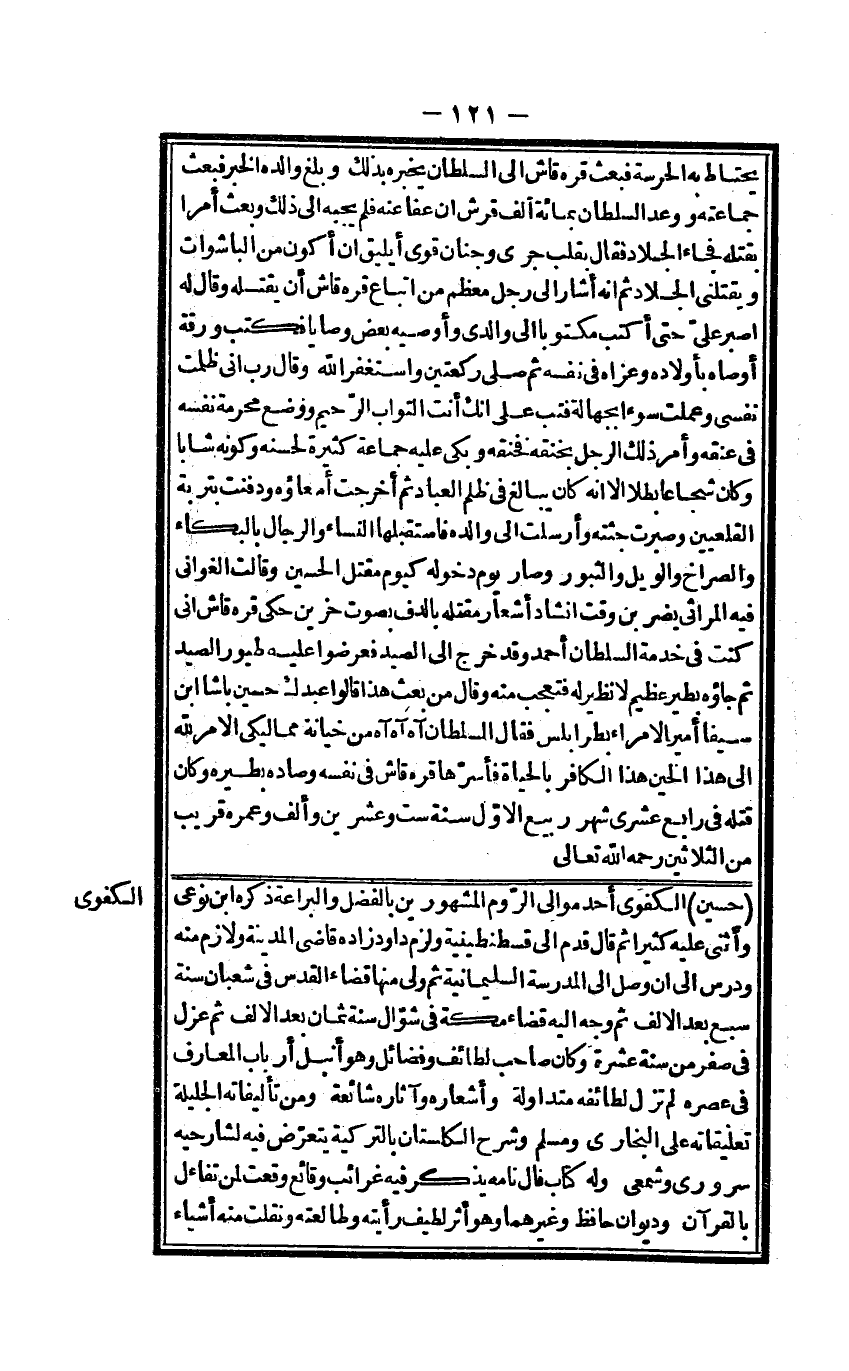 حُسَيْن الكفوي أحد موَالِي الرّوم الْمَشْهُورين بِالْفَضْلِ والبراعة ذكره ابْن نَوْعي واثنى عَلَيْهِ كثيرا ثمَّ قَالَ قدم إِلَى قسطنطينية وَلزِمَ دَاوُد زَاده قَاضِي الْمَدِينَة ولازم مِنْهُ ودرس إِلَى أَن وصل إِلَى الْمدرسَة السلمانية ثمَّ ولى مِنْهَا قَضَاء الْقُدس فِي شعْبَان سنة سبع بعد الْألف ثمَّ وَجه إِلَيْهِ قَضَاء مَكَّة فِي شَوَّال سنة ثَمَان بعد الْألف ثمَّ عزل فِي صفر من سنة عشرَة وَكَانَ صَاحب لطائف وفضائل وَهُوَ أنبل ارباب المعارف فِي عصره لم تزل لطائفه متداولة وأشعاره وآثاره شائعة وَمن تأليفاته الجليلة تعليقاته على البُخَارِيّ وَمُسلم وَشرح الكلستان بالتركية يتَعَرَّض فِيهِ لشارحيه سروري وشمعي وَله كتاب قَالَ نامه يذكر فِيهِ غرائب وقائع وَقعت لمن تفائل بِالْقُرْآنِ وديوان حَافظ وَغَيرهمَا وَهُوَ أثر لطيف رَأَيْته وطالعته ونقلت مِنْهُ أَشْيَاء