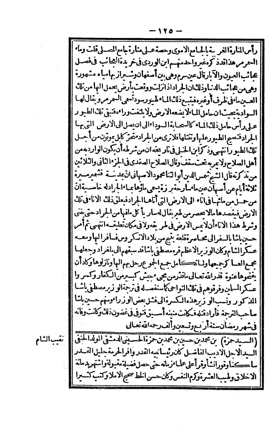 رَأس المنارة الغربية بالجامع الْأمَوِي وَحِصَّة على مَنَارَة جَامع الْمصلى قلت وَمَاء السمرمر هَذَا قد ذكره غير وَاحِد مِنْهُم ابْن الوردي فِي خريدة الْعَجَائِب فِي فصل عجائب الْعُيُون والآبار قَالَ عين سرم وَهِي بَين أصفهان وشيراز بهَا مياه مَشْهُورَة وَهِي من عجائب الدُّنْيَا وَذَلِكَ أَن الْجَرَاد إِذا نزلت وَوَقعت بِأَرْض يحمل إِلَيْهَا من تِلْكَ الْعين مَاء فِي ظرف أَو غَيره فَيتبع ذَلِك المَاء طيور سود تسمى السمرمر وَيُقَال لَهَا السوادية بِحَيْثُ أَن حَامِل المَاء لَا يَضَعهُ الأَرْض وَلَا يلْتَفت وَرَاءه فَتبقى تِلْكَ الطُّيُور على رَأس حَامِل ذَلِك المَاء كالسحابة السَّوْدَاء إِلَى أَن يصل إِلَى الأَرْض الَّتِي بهَا الْجَرَاد فَتُصْبِح الطُّيُور عَلَيْهَا وتقتلها فَلَا ترى من الْجَرَاد متحر كابل يموتون من أجل تِلْكَ الطُّيُور انْتهى وَذكر ابْن الْحَنْبَلِيّ فِي تَارِيخه أَن من شَرطه أَن يكون الْوَارِد بِهِ من أهل الصّلاح وَلَا يمر بِهِ تَحت سقف وَقَالَ الصّلاح الصَّفَدِي فِي الْجُزْء الثَّانِي وَالثَّلَاثِينَ من تَذكرته قَالَ الشَّيْخ شمس الدّين أَبُو الثنا مَحْمُود الْأَصْبَهَانِيّ أَن بِمَدِينَة قشمير مسيرَة ثَلَاثَة أَيَّام عَن أَصْبَهَان عين مَاء سارحة بَرزَة يُسمى مَاؤُهَا بِمَاء الْجَرَاد لَهُ خاصية أَن من حمل من مَائِهَا فِي إِنَاء إِلَى الأَرْض الَّتِي أَتَاهَا الْجَرَاد فيعلق ذلمك الْإِنَاء فِي تِلْكَ الأَرْض فيقصدها مَا لَا يحصر من طير يُقَال لَهُ سَار يَأْكُل مَا فِيهَا من الْجَرَاد حَتَّى يفنى وَشرط هَذَا الْإِنَاء أَن لَا يمس الأَرْض فِي طَرِيقه وَلَا فِي مَكَان تَعْلِيقه انْتهى ثمَّ أَمر حُسَيْن باشا بِالسَّفرِ إِلَى محاصرة قلعة بتيج من بِلَاد الأنكروس فسافر إِلَيْهَا وَمَعَهُ عَسْكَر الشَّام وَكَانَ الْوَزير الْأَعْظَم قُرَّة مصطفى باشا قد سبقهمْ إِلَى بلغراد وَجعلهَا مجمع العساكر جَمِيعهَا وَلما تَكَامل جمع الجموع رَحل بهم إِلَيْهَا ونازلوها وَكَاد أَن يفتحوها عنْوَة قدر الله تَعَالَى مَا قدر من مَجِيء جَيش كَبِير من الْكفَّار وكسروا عَسْكَر الْمُسلمين وفرقوهم فِي تِلْكَ النواحي كَمَا سنفصله فِي تَرْجَمَة الْوَزير مصطفى باشا الْمَذْكُور وَنسب الْوَزير هَذِه الكسرة إِلَى فشل بعض الوزراء وَمِنْهُم حُسَيْن باشا صَاحب التَّرْجَمَة فَأَرَادَ قَتله فَكَانَت منينه أسبق فتوفى فِي غُضُون ذَلِك وَكَانَت وَفَاته فِي شهر رَمَضَان سنة أَربع وَتِسْعين وَألف رَحمَه الله تَعَالَى