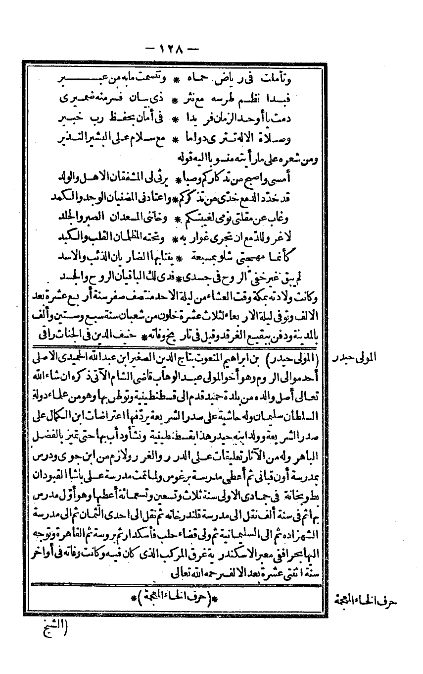 الْمولى حيدر بن إِبْرَاهِيم المنعوت بتاج الدّين الصَّغِير ابْن عبد الله الْحميدِي الْأَصْلِيّ أحد موَالِي الرّوم وَهُوَ أَخُو الْمولى عبد الْوَهَّاب قَاضِي الشَّام الْآتِي ذكره إِن شَاءَ الله تَعَالَى أصل وَالِده من بَلْدَة حميد قدم إِلَى قسطنطينة وتوطن بهَا وَهُوَ من عُلَمَاء دولة السُّلْطَان سُلَيْمَان وَله حَاشِيَة على صدر الشَّرِيعَة يرد فِيهَا إعتراضات ابْن الْكَمَال على صدر الشَّرِيعَة وَولد ابْنه حيدر هَذَا بقسطنطينة وَنَشَأ ودأب بهَا حَتَّى تميز بِالْفَضْلِ الباهر وَله من الْآثَار تعليقات على الدُّرَر وَالْغرر ولازم من ابْن جوى ودرس بمدرسة أون قباني ثمَّ أعْطى مدرسة برغوس وَلما تمت مدرسة عَليّ باشا القبودان بطوبخانة فِي جُمَادَى الأولى سنة ثَلَاث وَتِسْعين وَتِسْعمِائَة أعطيها وَهُوَ أول مدرس بهَا ثمَّ فِي سنة ألف نقل إِلَى مدرسة قلندرخانه ثمَّ نقل إِلَى إِحْدَى الثمان ثمَّ إِلَى مدرسة الشهزاده ثمَّ إِلَى السليمانية ثمَّ ولي قَضَاء حلب فأسكدار ثمَّ بروسة ثمَّ الْقَاهِرَة وَتوجه إِلَيْهَا بحراً فَفِي معبر الْإسْكَنْدَريَّة غرق الْمركب الَّذِي كَانَ فِيهِ وَكَانَت وَفَاته فِي أَوَاخِر سنة اثْنَتَيْ عشرَة بعد الْألف رَحمَه الله تَعَالَى