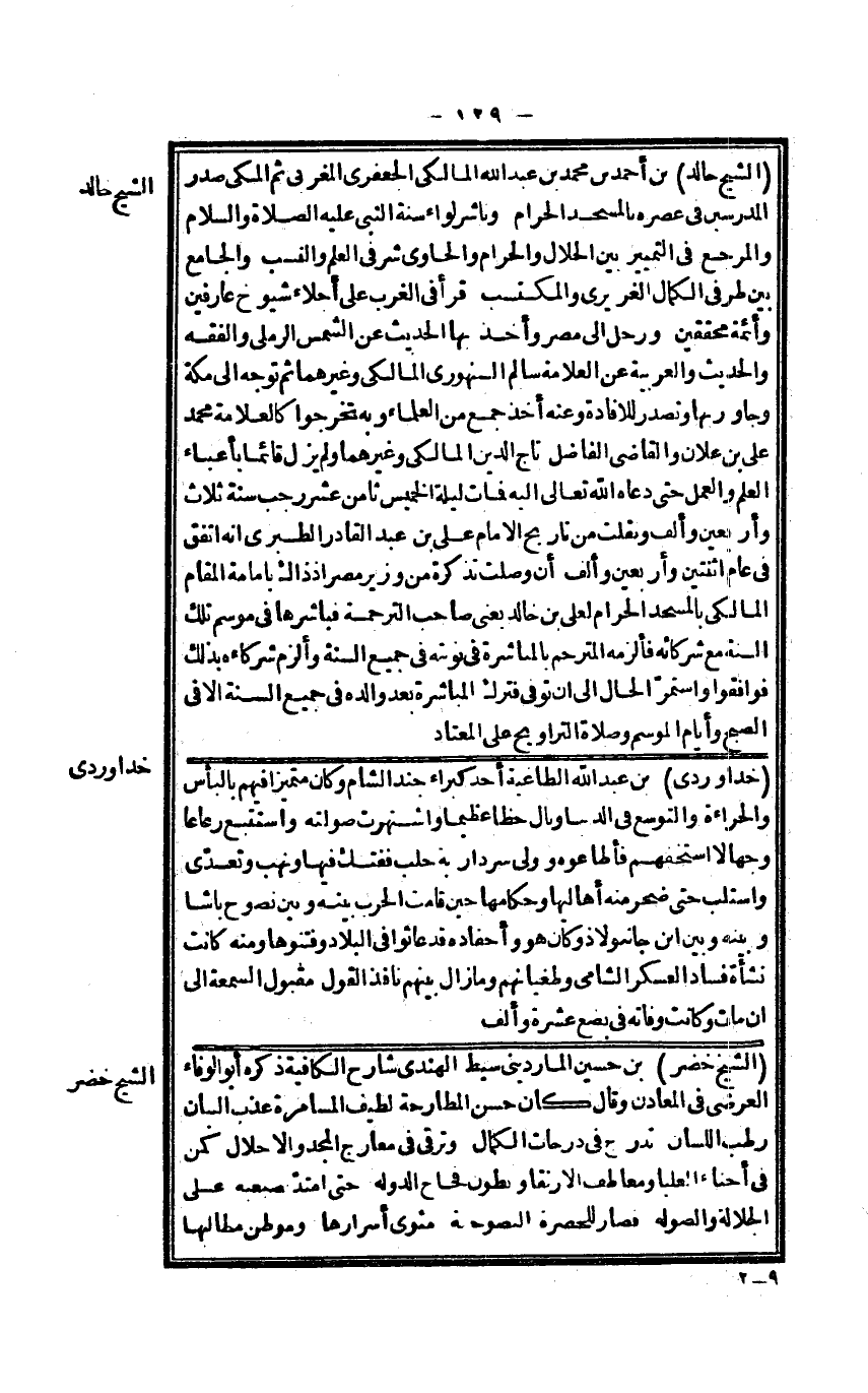 والمرجع فِي التَّمْيِيز بَين الْحَلَال وَالْحرَام وَالْحَاوِي شَرّ فِي الْعلم وَالنّسب وَالْجَامِع بَين طرفِي الْكَمَال الغزيزي والمكتسب قَرَأَ فِي الغرب على أجلاء شُيُوخ عارفين وأئمة محققين ورحل إِلَى مصر وَأخذ بهَا الحَدِيث عَن الشَّمْس الرَّمْلِيّ وَالْفِقْه والْحَدِيث والعربية عَن الْعَلامَة سَالم السنهوري الْمَالِكِي وَغَيرهمَا ثمَّ توجه إِلَى مَكَّة وجاور بهَا وتصدر للإفادة وَعنهُ أَخذ جمع من الْعلمَاء وَبِه تخْرجُوا كالعلامة مُحَمَّد عَليّ بن عَلان وَالْقَاضِي الْفَاضِل تَاج الدّين الْمَالِكِي وَغَيرهمَا وَلم يزل قَائِما بأعباء الْعلم وَالْعَمَل حَتَّى دَعَاهُ الله تَعَالَى إِلَيْهِ فَمَاتَ لَيْلَة الْخَمِيس ثامن عشر رَجَب سنة ثَلَاث وَأَرْبَعين وَألف ونقلت من تَارِيخ الإِمَام عَليّ بن عبد الْقَادِر الطَّبَرِيّ أَنه اتّفق فِي عَام اثْنَتَيْنِ وَأَرْبَعين وَألف أَن وصلت تذكرة من وَزِير مصر أذذاك بإمامة الْمقَام الْمَالِكِي بِالْمَسْجِدِ الْحَرَام لعَلي بن خَالِد يَعْنِي صَاحب التَّرْجَمَة فباشرها فِي موسم تِلْكَ السّنة مَعَ شركائه فألزمه المترجم بِالْمُبَاشرَةِ فِي نوته فِي جَمِيع السّنة وألزم شُرَكَاء بذلك فَوَافَقُوا وَاسْتمرّ الْحَال إِلَى أَن توفّي فَترك الْمُبَاشرَة بعد وَالِده فِي جَمِيع السّنة إِلَّا فِي الصبخ وَأَيَّام الْمَوْسِم وَصَلَاة التَّرَاوِيح على الْمُعْتَاد