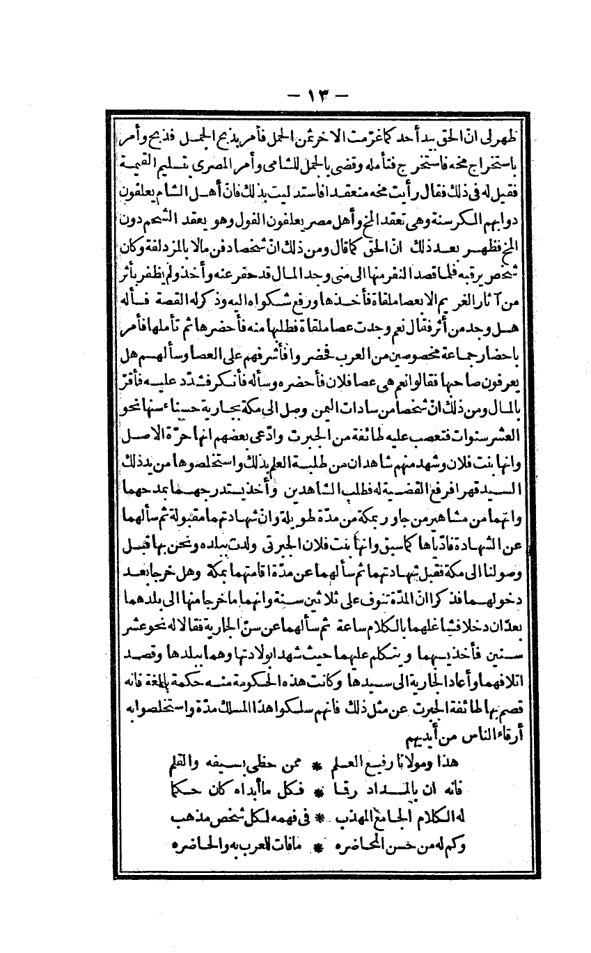 ظهر لي أَن الْحق بيد أحد كَمَا غرمت الآخر ثمن الْجمل فَأمر بِذبح الْجمل فذبح وَأمر باستخراج مخه فاستخرج فَتَأَمّله وَقضى بالجمل للشامي وَأمر الْمصْرِيّ بِتَسْلِيم الْقيمَة فَقيل لَهُ فِي ذَلِك رَأَيْت مخه منعقدا فاستدليت بذلك فَإِن أهل الشَّام يعلفون دوابهم الكرسنة وَهِي تعقد المخ وَأهل مصر يعلفون الفول وَهُوَ يعْقد الشَّحْم دون المخ فَظهر بعد ذَلِك أَن الْحق كَمَا قَالَ وَمن ذَلِك أَن شخصا دفن مَالا بِالْمُزْدَلِفَةِ وَكَانَ شخص يرقبه فَلَمَّا قصد لنفر مِنْهَا إِلَى منى وجد المَال قد حفر عَنهُ وَأخذ وَلم يظفر بأثر من آثَار الْغَرِيم إِلَّا بعصا ملقاة فَأَخذهَا وَرفع شكواه إِلَيْهِ وَذكر لَهُ الْقِصَّة فَسَأَلَهُ هَل وجد من أثر فَقَالَ نعم وجدت عَصا ملقاة فطلبها مِنْهُ فأحضرها ثمَّ تأملها فَأمر بإحضار جمَاعَة مخصوصين من الْعَرَب فَحَضَرُوا فأشرفهم على الْعَصَا وسألهم هَل يعْرفُونَ صَاحبهَا فَقَالُوا نعم هِيَ عَصا فلَان فَأحْضرهُ وَسَأَلَهُ فَأنْكر فَشدد عَلَيْهِ فَأقر بِالْمَالِ وَمن ذَلِك أَن شخصا من سَادَات الْيمن وصل إِلَى مَكَّة بِجَارِيَة حسنا مِنْهَا نَحْو الْعشْر سنوات فتعصب عَلَيْهِ طَائِفَة نم الجبرت وَادّعى بَعضهم أَنَّهَا حرَّة الأَصْل وَأَنَّهَا بنت فلَان وَشهد مِنْهُم شاهدات من طلبة الْعلم بذلك واستخلصوها من يَد ذَلِك السَّيِّد قهرا فَرفع الْقَضِيَّة لَهُ فَطلب الشَّاهِدين وَأخذ يستدرجهما بمدحهما وأنهما من مشاهير من جاور بِمَكَّة من مُدَّة طَوِيلَة وَأَن شَهَادَتهمَا مَقْبُولَة ثمَّ سَأَلَهُمَا عَن الشَّهَادَة فأدياها كَمَا سبق وَأَنَّهَا بنت فلَان الجبرتي ولدت بِبَلَدِهِ وَنحن بهَا قبل وصولنا إِلَى مَكَّة فَقبل شَهَادَتهمَا ثمَّ سَأَلَهُمَا عَن مُدَّة أقامتهما بِمَكَّة وَهل خرجا بعد دخولهما فَذكر أَن الْمدَّة تنوف على ثَلَاثِينَ سنة وأنهما مَا خرجا مِنْهَا إِلَى بلدهما بعد أَن دخلا فشاغلهما بالْكلَام سَاعَة ثمَّ سَأَلَهُمَا عَن سنّ الْجَارِيَة فَقَالَا لَهُ نَحْو عشر سِنِين فَأخذ يسبهما وَيتَكَلَّم عَلَيْهِمَا حَيْثُ شهد بولادتها وهما ببلدها وَقصد اتلافهما وَأعَاد الْجَارِيَة إِلَى سَيِّدهَا وَكَانَت هَذِه الْحُكُومَة مِنْهُ حِكْمَة بَالِغَة فَإِنَّهُ قَصم بهَا طَائِفَة الجبرت عَن مثل ذَلِك فَإِنَّهُم سلكوا هَذَا المسلك مُدَّة واستخلصوا بِهِ أرقاء النَّاس من أَيْديهم