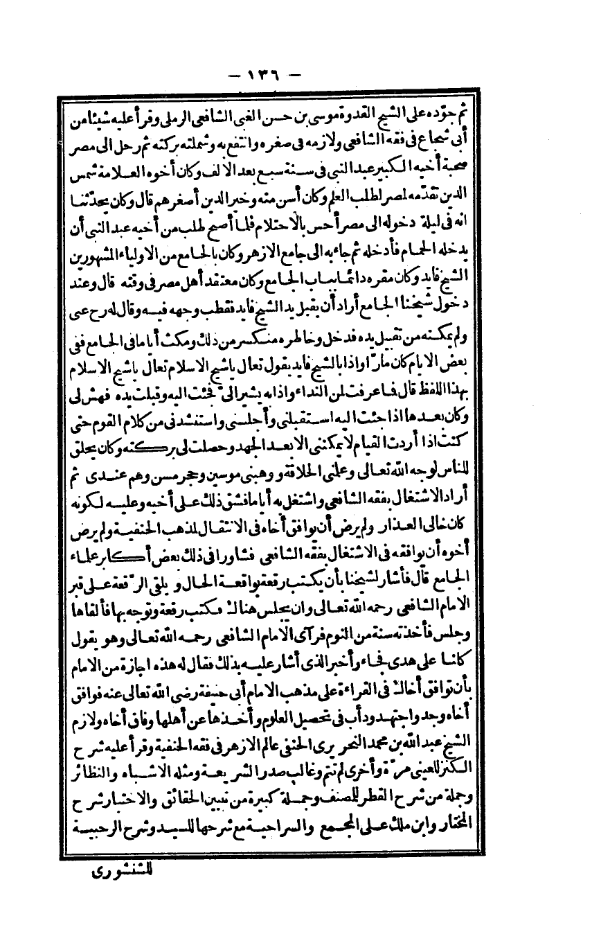 ثمَّ جوده على الشَّيْخ الْقدْوَة مُوسَى بن حسن الغبي الشَّافِعِي الرَّمْلِيّ وَقَرَأَ عَلَيْهِ شَيْئا من أبي شُجَاع فِي فقه الشَّافِعِي ولازمه فِي صغره وانتفع بِهِ وشملته بركته ثمَّ رَحل إِلَى مصر صُحْبَة أَخِيه الْكَبِير عبد النَّبِي فِي سنة سبع بعد الْألف وَكَانَ أَخُوهُ الْعَلامَة شمس الدّين تقدمه لمصر لطلب الْعلم وَكَانَ أسن مِنْهُ وَخير الدّين أَصْغَرهم قَالَ وَكَانَ يحدثنا أَنه فِي لَيْلَة دُخُوله إِلَى مصر أحس بالإحتلام فَلَمَّا أصبح طلب من أَخِيه عبد النَّبِي أَن يدْخلهُ الْحمام فَأدْخلهُ ثمَّ جَاءَ بِهِ إِلَى جَامع الْأَزْهَر وَكَانَ بالجامع من الْأَوْلِيَاء الْمَشْهُورين الشَّيْخ فأيد وَكَانَ مقره دَائِما بِبَاب الْجَامِع وَكَانَ مُعْتَقدًا أهل مصر فِي وقته قَالَ وَعند دُخُول شَيخنَا الْجَامِع أَرَادَ أَن يقبل يَد الشَّيْخ فَايِد فقطب وَجهه فِيهِ وَقَالَ لَهُ رحَ عني وَلم يُمكنهُ من تَقْبِيل يَده فَدخل وخاطره منكسر من ذَلِك وَمكث أَيَّامًا فِي الْجَامِع فَفِي بعض الْأَيَّام كَانَ مارا وَإِذا بالشيخ فَايِد يَقُول تعال يَا شيخ الْإِسْلَام تعال يَا شيخ الْإِسْلَام بِهَذَا اللَّفْظ قَالَ فَمَا عرفت لمن النداء وَإِذا بِهِ يُشِير إِلَيّ فَجئْت إِلَيْهِ وَقبلت يَده فهش لي وَكَانَ بعْدهَا إِذا جِئْت إِلَيْهِ استقبلني وأجلسني وأستنشدني من كَلَام الْقَوْم حَتَّى كنت إِذا أردْت الْقيام لَا يمكنني إِلَّا بعد الْجهد وحصلت لي بركته وَكَانَ يحلق للنَّاس لوجه الله تَعَالَى وَعَلمنِي الحلاقة ووهبني موسين وَحجر مسن وهم عِنْدِي ثمَّ أَرَادَ الِاشْتِغَال بِفقه الشَّافِعِي واشتغل بِهِ أَيَّامًا فشق ذَلِك على أَخِيه وَعَلِيهِ لكَونه كَانَ خَالِي العذار وَلم يرض أَن يُوَافق أَخَاهُ فِي الِانْتِقَال لمَذْهَب الْحَنَفِيَّة وَلم يرض أَخُوهُ أَن يُوَافقهُ فِي الِاشْتِغَال بِفقه الشَّافِعِي فَشَاور فِي ذَلِك بعض أكَابِر عُلَمَاء الْجَامِع قَالَ فَأَشَارَ لشَيْخِنَا بِأَن يكْتب رقْعَة بواقعة الْحَال ويلقي الرقعة على قبر الإِمَام الشَّافِعِي رَحمَه الله تَعَالَى وَأَن يجلس هُنَاكَ فَكتب رقْعَة وَتوجه بهَا فألقاها وَجلسَ فَأَخَذته سنة من النّوم فرآى الإِمَام الشَّافِعِي رَحمَه الله تَعَالَى وَهُوَ يَقُول كلنا على هدى فجَاء وَأخْبر الَّذِي أَشَارَ عَلَيْهِ بذلك فَقَالَ لَهُ هَذِه إجَازَة من الإِمَام بِأَن توَافق أَخَاك فِي الْقِرَاءَة على مَذْهَب الإِمَام أبي حنيفَة رَضِي الله تَعَالَى عَنهُ فَوَافَقَ أَخَاهُ وجد واجتهد ودأب فِي تَحْصِيل الْعُلُوم وَأَخذهَا عَن أَهلهَا وفَاق أَخَاهُ ولازم الشَّيْخ عبد الله بن مُحَمَّد النحريري الْحَنَفِيّ علام الْأَزْهَر فِي فقه الْحَنَفِيَّة وَقَرَأَ عَلَيْهِ شرح الْكَنْز للعيني مرّة وَأُخْرَى لم تتمّ وغالب صدر الشَّرِيعَة وَمثله الْأَشْبَاه والنظائر وَجُمْلَة من شرح الْقطر للْمُصَنف وَجُمْلَة كَبِيرَة من تَبْيِين الْحَقَائِق وَالِاخْتِيَار شرح الْمُخْتَار وَابْن ملك على الْمجمع والسراجية مَعَ شرحها للسَّيِّد وَشرح الرحبية