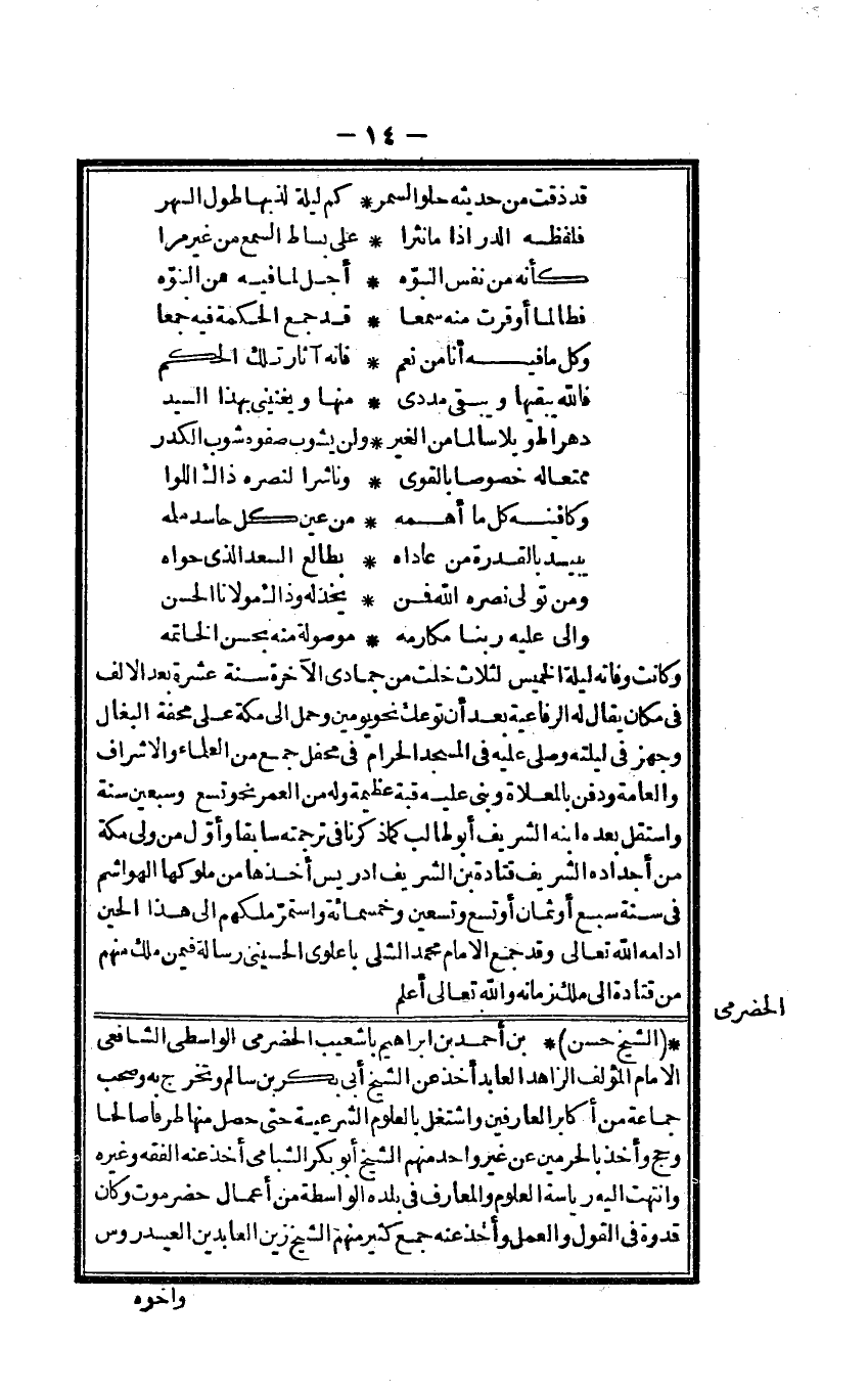 الشَّيْخ حسن بن أَحْمد بن إِبْرَاهِيم أَبَا شُعَيْب الْحَضْرَمِيّ الوَاسِطِيّ الشَّافِعِي الإِمَام الْمُؤلف الزَّاهِد العابد أَخذ عَن الشَّيْخ أبي بكر بن سَالم وَتخرج بِهِ وَصَحب جمَاعَة من أكَابِر العارفين واشتغل بالعلوم الشَّرْعِيَّة حَتَّى حصل مِنْهَا طرفا صَالحا وَحج وَأخذ بالحرمين عَن غير وَاحِد مِنْهُم الشَّيْخ أَبُو بكر الشبامي أَخذ عَنهُ الْفِقْه وَغَيره وانتهت إِلَيْهِ رياسة الْعُلُوم والمعارف فِي بَلَده الْوَاسِطَة من أَعمال حضر موت وَكَانَ قدوة فِي القَوْل وَالْعَمَل وَأخذ عَنهُ جمع كثير مِنْهُم الشَّيْخ زين العابدين العيدروس