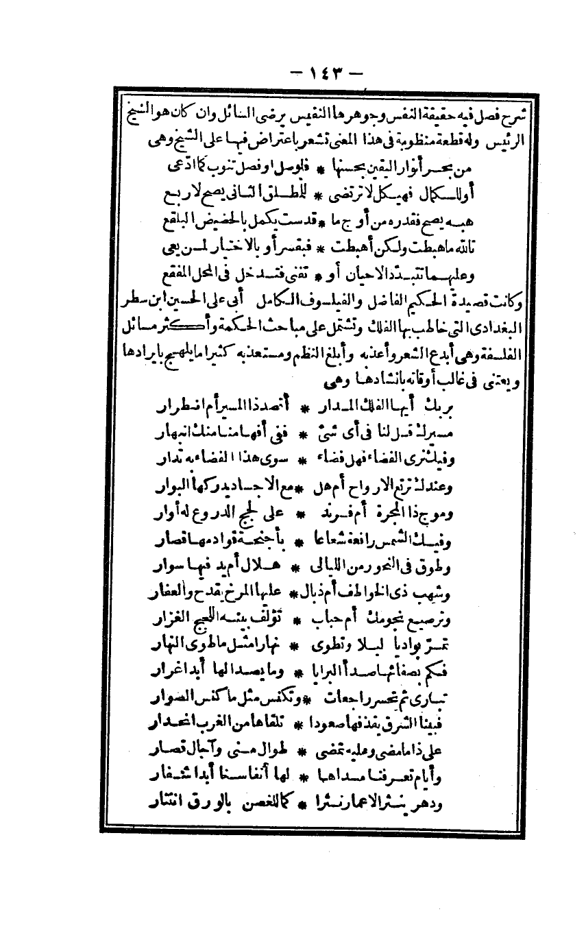 شرح فصل فِيهِ حَقِيقَة النَّفس وجوهرها النفيس يُرْضِي السَّائِل وان كَانَ هُوَ الشَّيْخ الرئيس وَله قِطْعَة منظومة فِي هَذَا الْمَعْنى تشعر باعتراض فِيهَا على الشَّيْخ وَهِي