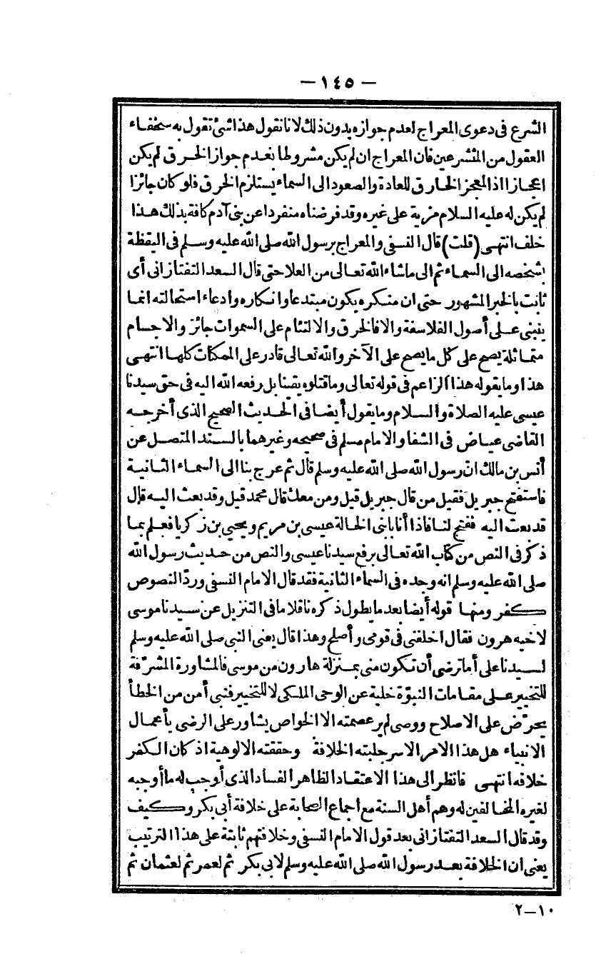 فِي الْيَقَظَة بشخصه إِلَى السَّمَاء ثمَّ إِلَى مَا شَاءَ الله تَعَالَى من الْعلَا حَتَّى قَالَ السعد التَّفْتَازَانِيّ أَي ثَابت بالْخبر الْمَشْهُور حَتَّى إِن منكره يكون مبتدعا وإنكاره وإدعاء استحالته إِنَّمَا يتبنى على أصُول الفلاسفة وَإِلَّا فالخرق والالتئام على السَّمَوَات جَائِز والأجسام متماثلة يَصح على كل مَا يَصح على الآخر وَالله تَعَالَى قَادر على الممكنات كلهَا انْتهى هَذَا وَمَا يَقُوله هَذَا الزاعم فِي قَوْله تَعَالَى وَمَا قَتَلُوهُ يَقِينا بل رَفعه الله إِلَيْهِ فِي حق سيدنَا عِيسَى عَلَيْهِ الصَّلَاة وَالسَّلَام وَمَا يَقُول أَيْضا فِي الحَدِيث الصَّحِيح الَّذِي أخرجه القَاضِي عِيَاض فِي الشفا وَالْإِمَام مُسلم فِي صَحِيحه وَغَيرهمَا بالسند الْمُتَّصِل عَن أنس بن مَالك أَن رَسُول الله