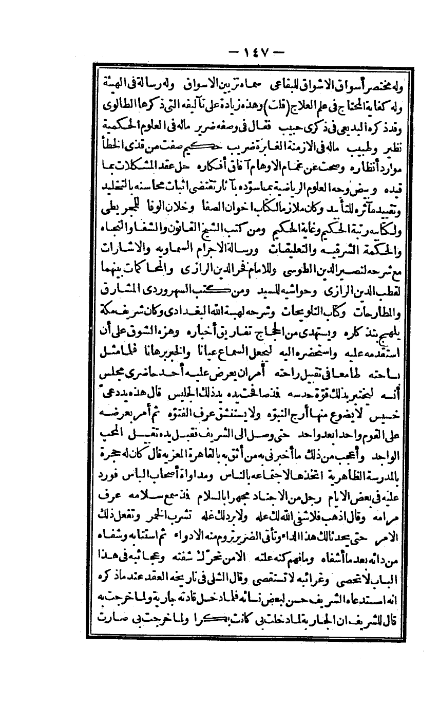 وَله مُخْتَصر أسواق الأشواق للبقاعي سَمَّاهُ تَزْيِين الْأَسْوَاق وَله رِسَالَة فِي الْهَيْئَة وَله كِفَايَة الْمُحْتَاج فِي علم العلاج قلت وَهَذِه زِيَادَة على تأليفه الَّتِي ذكرهَا الطالوي وَقد ذكره البديعي فِي ذكرى حبيب فَقَالَ فِي وَصفه ضَرِير مَاله فِي الْعُلُوم الْحكمِيَّة نَظِير وطبيب مَاله فِي الْأَزْمِنَة الغابرة ضريب حَكِيم صفت من قذى الْخَطَأ موارد أنظاره وَصحت عَن غمام الأوهام آفَاق أفكاره حل عقد المشكلات بِمَا قَيده وبيض وَجه الْعُلُوم الرياضية بِمَا سوده بآثار تَقْتَضِي إِثْبَات محاسنه بالتخليد وَتَقْيِيد مآثره للتأبيد وَكَانَ ملازما لكتاب اخوان الصَّفَا وخلان الوفا للمجريطي ولكتابيه رُتْبَة الْحَكِيم وَغَايَة الْحَكِيم وَمن كتب الشَّيْخ القانون والشفا والنجاة وَالْحكمَة الشرقية والتعليقات ورسالة الأجرام السماوية والإشارات مَعَ شَرحه لنصير الدّين الطوسي وَللْإِمَام فَخر الدّين الرَّازِيّ والمحاكمات بَينهمَا لقطب الدّين الرَّازِيّ وحواشيه للسَّيِّد وَمن كتب السهروردي الْمَشَارِق والمطارحات وَكتاب التلويحات وَشَرحه لهبة الله الْبَغْدَادِيّ وَكَانَ شرِيف مَكَّة يلهج بتذكاره ويستهدي من الْحجَّاج تفاريق أخباره وهزه الشوق على أَن استقدمه عَلَيْهِ واستحضره إِلَيْهِ ليجعل السماع عيَانًا وَالْخَبَر برهانا فَلَمَّا مثل بساحته طامعا فِي تَقْبِيل رَاحَته أَمر أَن يعرض عَلَيْهِ أحد حاضري مجْلِس أنسه ليختبر بذلك قُوَّة حدسه فمذ صافحت يَده يَد ذَلِك الجليس قَالَ هَذِه يَد دعى خسيس لَا يضوع مِنْهَا أرج النُّبُوَّة وَلَا يستنشق عرف الفتوة ثمَّ أَمر بعرضه على الْقَوْم وَاحِدًا بعد وَاحِد حَتَّى وصل إِلَى الشريف فَقبل يَده تَقْبِيل الْمُحب الْوَاجِد وأعجب من ذَلِك مَا أَخْبرنِي بِهِ من أَثِق بِهِ بِالْقَاهِرَةِ المعزية قَالَ كَانَ لَهُ حجرَة بِالْمَدْرَسَةِ الظَّاهِرِيَّة اتخذها لإجتماعه بِالنَّاسِ ومداواة أَصْحَاب الباس فورد عَلَيْهِ فِي بعض الْأَيَّام رجل من الِاجْتِهَاد مجهر بِالسَّلَامِ فمذ سمع سَلَامه عرف مرامه وَقَالَ اذْهَبْ فَلَا شفى الله لَك عِلّة وَلَا برد الله لَك غله تشرب الْخمر وَتفعل لَك الْأَمر حَتَّى يحدثا لَك هَذَا الدَّاء وَتَأْتِي الضَّرِير تروم مِنْهُ الأدواء ثمَّ استتابه وشفاه من دائه بعد مَا أشفاه وَمَا فهم كنه علته الْأَمْن تحرّك شفته وعجائبه فِي هَذَا الْبَاب لَا تحصى وغرائبه لَا تستقصى وَقَالَ الشلي فِي تَارِيخه العقد عِنْدَمَا ذكره أَنه استدعاه الشريف حسن لبَعض نِسَائِهِ فَلَمَّا دخل قادته جَارِيَة وَلما خرجت بِهِ قَالَ للشريف إِن الْجَارِيَة لما دخلت بِي كَانَت بكرا وَلما خرجت بِي صَارَت