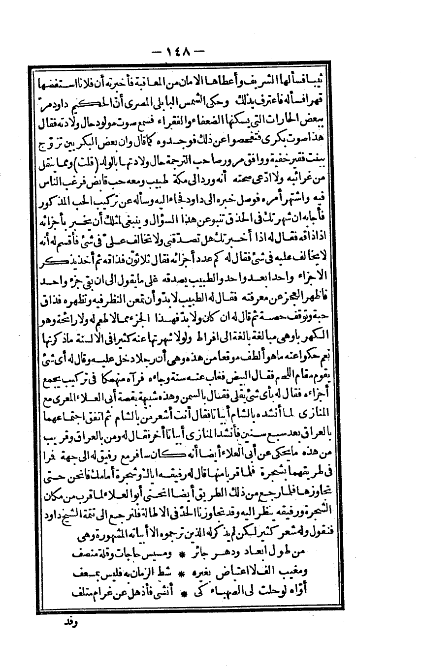 ثَيِّبًا فَسَأَلَهَا الشريف وَأَعْطَاهَا الْأمان من المعاقبة فَأَخْبَرته أَن فلَانا استفضها قهرا فَسَأَلَهُ فاعترف بذلك وَحكى الشَّمْس البابلي الْمصْرِيّ أَن الْحَكِيم دَاوُد مر بِبَعْض الحارات الَّتِي يسكنهَا الضُّعَفَاء والفقراء فَسمع صَوت مَوْلُود حَال وِلَادَته فَقَالَ هَذَا صَوت بكري فتفحصوا عَن ذَلِك فوجدوه كَمَا قَالَ وَإِن بعض البكريين تزوج ببنت فَقير خُفْيَة وَوَافَقَ مُرُور صَاحب التَّرْجَمَة حَال وِلَادَتهَا بِالْوَلَدِ قلت وَمِمَّا ينْقل من غَرَائِبه وَلَا أَدعِي صِحَّته أَنه ورد إِلَى مَكَّة طَبِيب وَمَعَهُ حب قَابض فَرغب النَّاس فِيهِ واشتهر أمره فوصل خَبره إِلَى دَاوُد فجَاء إِلَيْهِ وَسَأَلَهُ عَن تركيب الْحبّ الْمَذْكُور فَأَجَابَهُ أَن شهرتك فِي الحذق تنبو عَن هَذَا السُّؤَال وَيَنْبَغِي لمثلك أَن يخبر بأجزائه إِذا أذاقه فَقَالَ لَهُ إِذا أَخْبَرتك هَل تصدقني وَلَا تخَالف على فِي شَيْء فأقسم لَهُ أَنه لايخالف عَلَيْهِ فِي شيئ فَقَالَ لَهُ كم عدد أَجْزَائِهِ فَقَالَ ثَلَاثُونَ فذاقه ثمَّ أَخذ يذكر الْأَجْزَاء وَاحِدًا بعد وَاحِد والطبيب يصدقهُ على مَا يَقُول إِلَى أَن بَقِي جُزْء وَاحِد فاظهر الْعَجز عَن مَعْرفَته فَقَالَ لَهُ الطَّبِيب لَا بُد وَأَن تمعن النّظر فِيهِ وتظهره فذاق حَبَّة وَتوقف حِصَّة ثمَّ قَالَ لَهُ أَن كَانَ وَلَا بُد فَهَذَا الْجُزْء مِمَّا لَا طعم لَهُ وَلَا رَائِحَة وَهُوَ الكهربا وَهِي مُبَالغَة بَالِغَة إِلَى إفراط وَلَوْلَا شهرتها عَنهُ كثيرا فِي الْأَلْسِنَة مَا ذكرتها نعم حكوا عَنهُ مَا هُوَ ألطف موقعا من هَذِه وَهِي أَن رجلا دخل عَلَيْهِ وَقَالَ لَهُ أَي شَيْء يقوم مقَام اللَّحْم فَقَالَ الْبيض فَغَاب عَنهُ سنة وجاءه فَرَآهُ منهمكا فِي تركيب يجمع أجزاءه فَقَالَ لَهُ بِأَيّ شَيْء يقلى فَقَالَ بالسمن وَهَذِه شَبيهَة بِقصَّة أبي الْعَلَاء المعري مَعَ المنازي لما أنْشدهُ بِالشَّام أبياتا فَقَالَ أَنْت أشعر من بِالشَّام ثمَّ اتّفق اجْتِمَاعهمَا بالعراق بعد سبع سِنِين فَأَنْشد المنازي أبياتا أخر فَقَالَ لَهُ وَمن بالعراق قريب من هَذِه مَا يحْكى ى عَن أبي الْعَلَاء أَيْضا أَنه كَانَ سَافر مَعَ رَفِيق لَهُ إِلَى جِهَة فمرا فِي طريقهما بشجرة فَلَمَّا قربا مِنْهَا قَالَ لَهُ رَفِيقه إياك وشجرة أمامك فا نَحن حَتَّى تجاوزها فَلَمَّا رَجَعَ من ذَلِك الطَّرِيق أَيْضا انحنى أَبُو الْعَلَاء لما قرب من مَكَان الشَّجَرَة ورفيقه ينظر إِلَيْهِ وَقد تجاوزنا الْحَد فِي الإطالة فلنرجع إِلَى تَتِمَّة الشَّيْخ دَاوُد فَنَقُول وَله شعر كثير لَكِن لم يذكرله الَّذين ترجموه إِلَّا أبياته الْمَشْهُورَة وَهِي