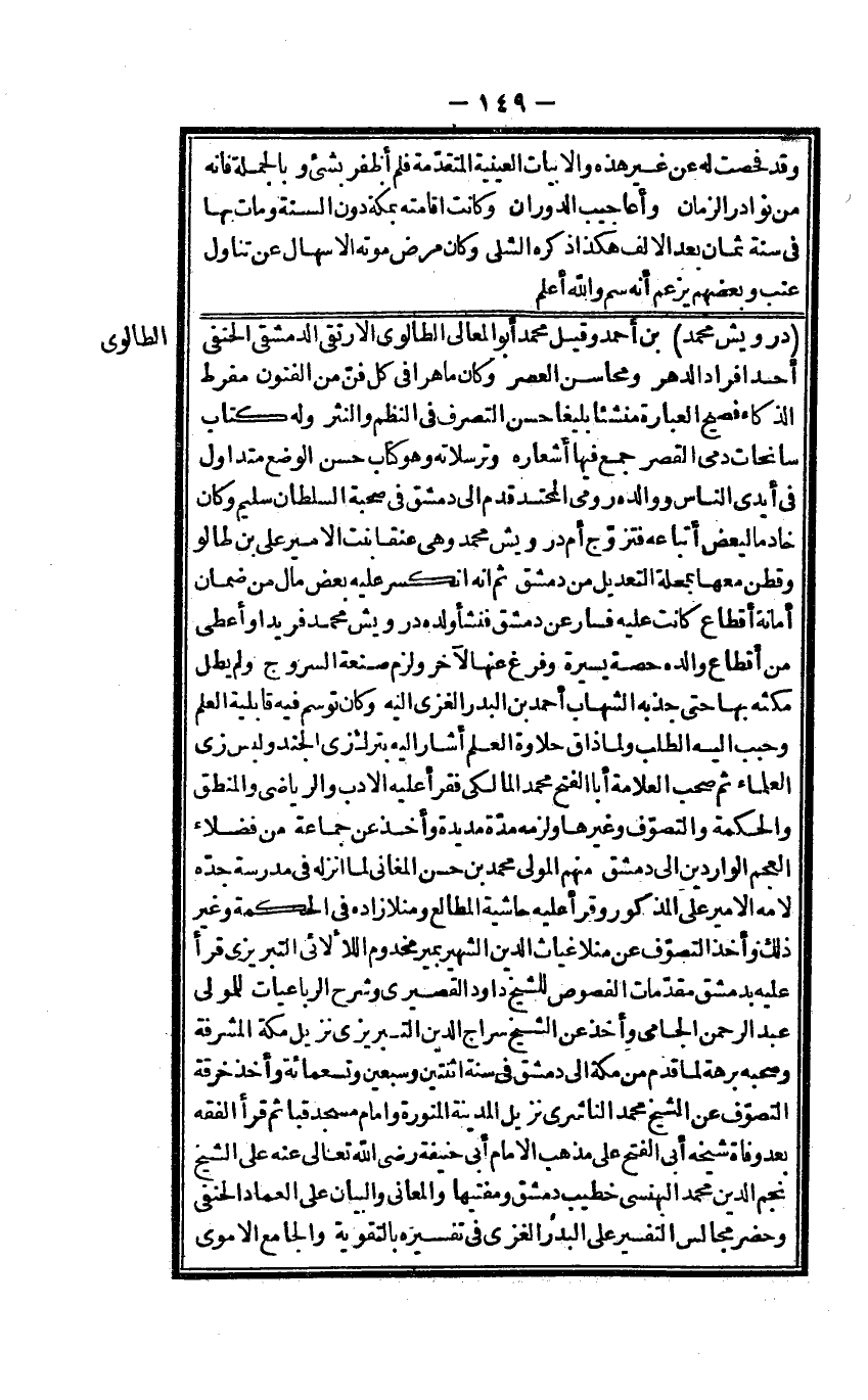 درويش مُحَمَّد بن أَحْمد وَقيل مُحَمَّد أَبُو الْمَعَالِي الطالوي الأرتقي الدِّمَشْقِي الْحَنَفِيّ أحد أَفْرَاد الدَّهْر ومحاسن الْعَصْر وَكَانَ ماهرا فِي كل فن من الْفُنُون مفرط الذكاء فصيح الْعبارَة منشئا بليغا حسن التَّصَرُّف فِي النّظم والنثر وَله كتاب سانحات دمى الْقصر جمع فِيهَا أشعاره وترسلاته وَهُوَ كتاب حسن الْوَضع متداول فِي أَيدي النَّاس ووالده رومي المحتد قدم إِلَى دمشق فِي صُحْبَة السُّلْطَان سليم وَكَانَ خَادِمًا لبَعض أَتْبَاعه فَتزَوج أم درويش مُحَمَّد وَهِي عنقًا بنت الْأَمِير عَليّ بن طالو وقطن مَعهَا بمحلة التَّعْدِيل من دمشق ثمَّ إِنَّه انْكَسَرَ عَلَيْهِ بعض مَال من ضَمَان أَمَانَة أقطاع كَانَت عَلَيْهِ فسارعن دمشق فَنَشَأَ وَلَده درويش مُحَمَّد فريدا وَأعْطى من أقطاع وَالِده حِصَّة يسيرَة وَفرغ عَنْهَا الآخر وَلزِمَ صَنْعَة السُّرُوج وَلم يطلّ مكثه بهَا حَتَّى جذبه الشهَاب أَحْمد بن الْبَدْر الْعزي إِلَيْهِ وَكَانَ توسم فِيهِ قابلية الْعلم وحبب إِلَيْهِ الطّلب وَلما ذاق حلاوة الْعلم أَشَارَ إِلَيْهِ بترك زِيّ الْجند وَلبس زِيّ الْعلمَاء ثمَّ صحب الْعَلامَة أَبَا الْفَتْح مُحَمَّد الْمَالِكِي فَقَرَأَ عَلَيْهِ الْأَدَب والرياضي والمنطق وَالْحكمَة والتصوف وَغَيرهَا وَلَزِمَه مُدَّة مديدة وَأخذ عَن جمَاعَة من فضلاء الْعَجم الواردين إِلَى دمشق مِنْهُم الْمولى مُحَمَّد بن حسن المغاني وَلما أنزلهُ فِي مدرسة جده لأمه الْأَمِير عَليّ الْمَذْكُور وَقَرَأَ عَلَيْهِ حَاشِيَة الْمطَالع ومنلا زَاده فِي الْحِكْمَة وَغير ذَلِك وَأخذ التصوف عَن منلا غياث الدّين الشهير بمير مخدوم اللألائي التبريزي قَرَأَ عَلَيْهِ بِدِمَشْق مُقَدمَات الفصوص للشَّيْخ دَاوُد القيصري وَشرح الرباعيات للْمولى عبد الرَّحْمَن الجامي وَأخذ عَن الشَّيْخ سراج الدّين التبريزي نزيل مَكَّة المشرفة وَصَحبه بُرْهَة لما قدم من مَكَّة إِلَى دمشق فِي سنة اثْنَتَيْنِ وَسبعين وَتِسْعمِائَة وَأخذ فرقة التصوف عَن الشَّيْخ مُحَمَّد النَّاشِرِيّ نزيل الْمَدِينَة المنورة وَإِمَام مَسْجِد قبَاء ثمَّ قَرَأَ الْفِقْه بعد وَفَاة شَيْخه أبي الْفَتْح على مَذْهَب الإِمَام أبي حنيفَة رَضِي الله تَعَالَى عَنهُ على الشَّيْخ نجم الدّين مُحَمَّد البهنسي خطيب دمشق ومفتيها والمعاني وَالْبَيَان على الْعِمَاد الْحَنَفِيّ وَحضر مجَالِس التَّفْسِير عَليّ الْبَدْر الْعزي فِي تَفْسِيره بالتقوية وَالْجَامِع الْأمَوِي