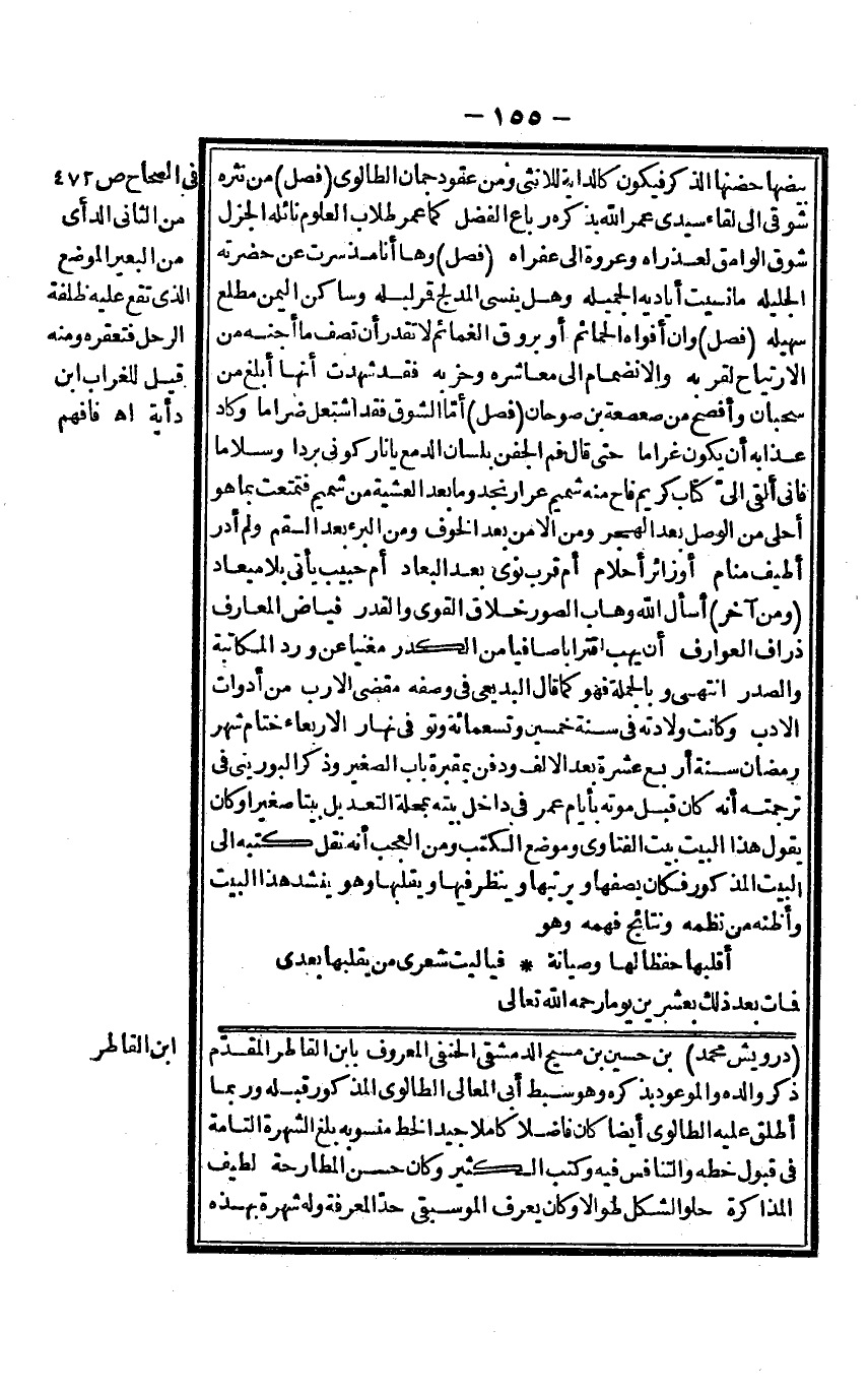 بيضها حضنها الذّكر فَيكون كالداية للْأُنْثَى وَمن عُقُود جمان الطالوي فصل من نثره شوقي إِلَى لِقَاء سَيِّدي عمر الله يذكرهُ رباع الْفضل كَمَا عمر طلاب الْعُلُوم نائله الجزل شوق الوامق لعذراه وَعُرْوَة إِلَى عفراه فصل وَهَا أَنا مذ سرت عَن حَضرته الجليلة مَا نسيت أيادية الجميلة وَهل ينسى المدلج قمر لَيْلَة وَسَاكن الْيمن مطلع سهيلة فصل وَإِن أَفْوَاه الحمائم أَو بروق الغمائم لَا تقدر أَن تصف مَا أجنه من الأرتياح لقُرْبه والإنضمام إِلَى معاشره وَحزبه فقد شهِدت أَنَّهَا أبلغ من سحبان وأفصح من صعصعة بن صوحا فصل أما الشوق فقد اشتعل ضراما وَكَاد عَذَابه إِن يكون غراماً حَتَّى قَالَ فَم الجفن بِلِسَان الدمع يَا نَار كوني بردا وَسلَامًا فَإِنِّي ألْقى إِلَيّ كتاب كريم فاح مِنْهُ شميم عرار نجد وَمَا بعد العشية من شميم فتمتعت بِمَا هُوَ أحلى من الْوَصْل بعد الهجر وَمن الْأَمْن بعد الْخَوْف وَمن الْبُرْء بعد السقم وَلم أدر أطيف مَنَام أَو زائر أَحْلَام أم قرب نوى بعد البعاد أم حبيب يَأْتِي بِلَا ميعاد وَمن آخر أسأَل الله وهاب الصُّور خلاق الْقوي وَالْقدر فياض المعارف ذراف العوارف أَن يهب اقترابا صافيا من الكدر مغنيا عَن ورد الْمُكَاتبَة والصدر انْتهى وَبِالْجُمْلَةِ فَهُوَ كَمَا قَالَ البديعي فِي وَصفه مقضى الأرب من أدوات الْأَدَب وَكَانَت وِلَادَته فِي سنة خمسين وَتِسْعمِائَة وَتُوفِّي نَهَار الْأَرْبَعَاء ختام شهر رَمَضَان سنة أَربع عشرَة بعد الْألف وَدفن بمقبرة بَاب الصَّغِير وَذكر البوريني فِي تَرْجَمته أَنه كَانَ قبل مَوته بأيام عمر فِي دَاخل بَيته بمحلة التَّعْدِيل بَيْتا صَغِيرا وَكَانَ يَقُول هَذَا الْبَيْت بَيت الفتاوي وَمَوْضِع الْكتب وَمن الْعجب أَنه نقل كتبه إِلَى الْبَيْت الْمَذْكُور فَكَانَ يصفها ويرتبها وَينظر فِيهَا ويقلبها وَهُوَ ينشد هَذَا الْبَيْت وَأَظنهُ من نظمه ونتائج فهمه وَهُوَ