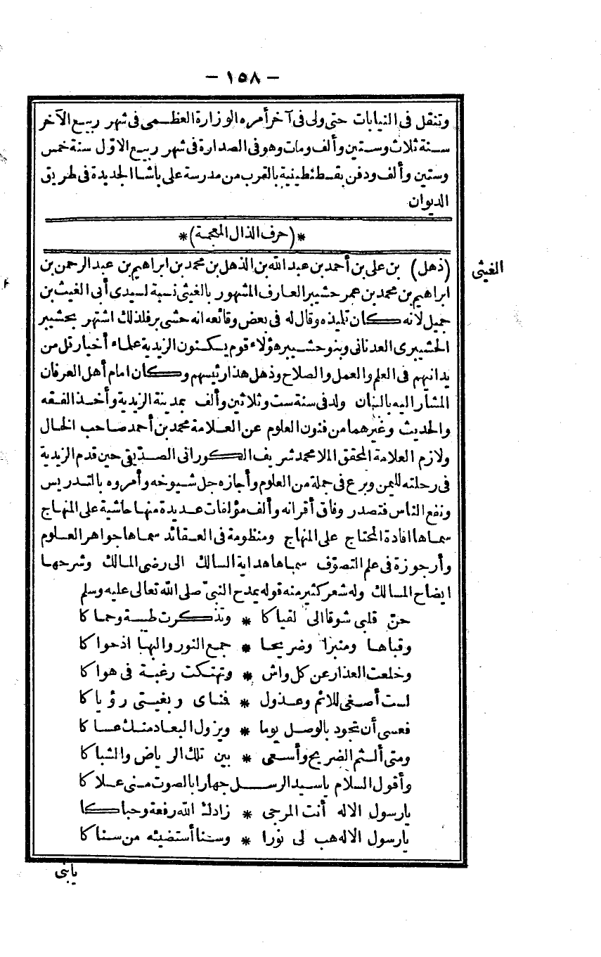 ذهل بن عَليّ بن أَحْمد بن عبد الله بن الذهل بن مُحَمَّد بن إِبْرَاهِيم بن عبد الرَّحْمَن بن إِبْرَاهِيم بن مُحَمَّد عمر بن حشيبر الْعَارِف الْمَشْهُور بالغيثي نِسْبَة لسيدي أبي الْغَيْث بن جميل لِأَنَّهُ كَانَ تلميذة وَقَالَ لَهُ فِي بعض وقائعه أَنه حشي بر فَلذَلِك اشْتهر بحشيبر الحشبيري العدناني وَبَنُو حشبير هَؤُلَاءِ قوم يسكنون الزيدية عُلَمَاء أخيار قل من يدانيهم فِي الْعلم وَالْعَمَل وَالصَّلَاح وَذهل هَذَا رئيسهم وَكَانَ إِمَام أهل الْعرْفَان الْمشَار إِلَيْهِ بالبنان ولد فِي سنة سِتّ وَثَلَاثِينَ وَألف بِمَدِينَة الزيدية وَأخذ الْفِقْه والْحَدِيث وَغَيرهمَا من فنون الْعُلُوم عَن الْعَلامَة مُحَمَّد بن أَحْمد صَاحب الْخَال ولازم الْعَلامَة الْمُحَقق الملا مُحَمَّد شرِيف الكوراني الصديقي حِين قدم الزيدية فِي رحلته لليمن وبرع فِي جملَة من الْعُلُوم وَأَجَازَهُ جلّ شُيُوخه وأمروه بالتدريس ونفع النَّاس فتصدر وفَاق أقرانه وَألف مؤلفات عديدة مِنْهَا حَاشِيَة على الْمِنْهَاج سَمَّاهَا إِفَادَة الْمُحْتَاج على الْمِنْهَاج ومنظومة فِي العقائد سَمَّاهَا جَوَاهِر الْعُلُوم وأرجوزة فِي علم التَّصَرُّف سَمَّاهَا هِدَايَة السالك إِلَى رَضِي الْمَالِك وَشَرحهَا إِيضَاح المسالك وَله شعر كَثِيرَة مِنْهُ قَوْله يمدح النَّبِي