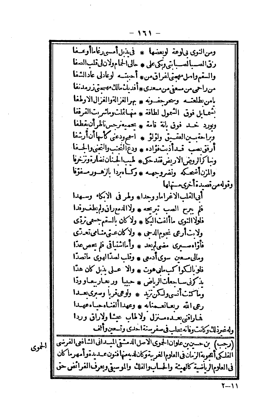رَجَب بن حُسَيْن بن علوان الْحَمَوِيّ الأَصْل الدِّمَشْقِي الميداني الشَّافِعِي الفرضي الفلكي أعجوبة الزَّمَان فِي الْعُلُوم الغربية وَكَانَ لَدَيْهِ مِنْهَا فنون عديدة وأمهر مَا كَانَ فِي الْعُلُوم الرياضية كالهيئة والحساب والفلك والموسيقى وَيعرف الْفَرَائِض حق