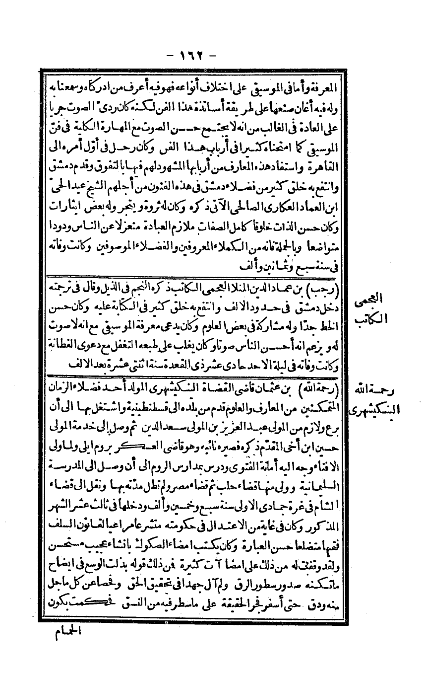 الْمعرفَة وَأما فِي الموسيقى عل إختلاف أَنْوَاعه فَهُوَ فِيهِ أعرف من أدركناه وَسَمعنَا بِهِ وَله فِيهِ أغان صنعها على طَريقَة أساتذة هَذَا الْفَنّ لكنه كَانَ ردي الصَّوْت جَريا على الْعَادة فِي الْغَالِب من أَنه لَا يجْتَمع حسن الصَّوْت مَعَ المهارة الْكُلية فِي فن الموسيقى كَمَا امتحناه كثيرا فِي أَرْبَاب هَذَا الْفَنّ وَكَانَ رَحل فِي أول أمره إِلَى الْقَاهِرَة واستفاد هَذِه المعارف من أَرْبَابهَا الْمَشْهُود لَهُم فِيهَا بالتفوق وَقدم دمشق وانتفع بِهِ خلق كثير من فضلاء دمشق فِي هَذِه الْفُنُون من أَجلهم الشَّيْخ عبد الْحَيّ ابْن الْعِمَاد العكاري الصَّالِحِي الْآتِي ذكره وَكَانَ لَهُ ثروة ويتجر وَله بعض ايثارات وَكَانَ حسن الذَّات خلوقا كَامِل الصِّفَات ملازم الْعِبَادَة منغزلا عَن النَّاس ودودا متواضعا وَبِالْجُمْلَةِ فَإِنَّهُ من الكملاء المعروفين والفضلاء الموصوفين وَكَانَت وَفَاته فِي سنة سبع وَثَمَانِينَ وَألف