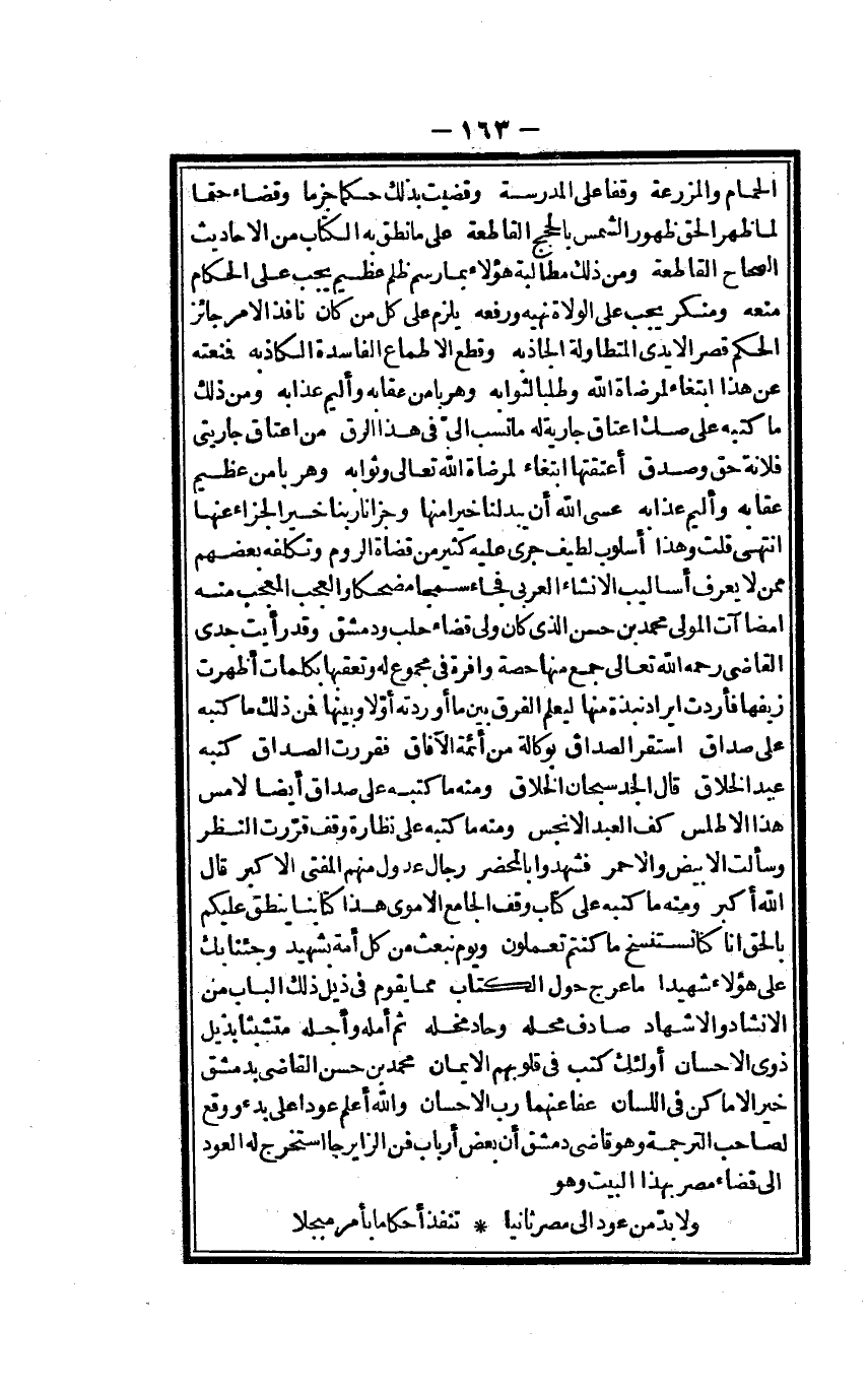 الْحمام والمزرعة وَقفا على الْمدرسَة وقضيت بذلك حكما جزما وَقَضَاء حتما لما ظهر الْحق ظُهُور الشَّمْس بالحجج القاطعة على مَا نطق بِهِ الْكتاب من الْأَحَادِيث الصِّحَاح القاطعة وَمن ذَلِك مُطَالبَة هَؤُلَاءِ بمراسم ظلم عَظِيم يجب على الْحُكَّام مَنعه ومنكر يجب على الْوُلَاة نَهْيه وَرَفعه يلْزم على كل من كَانَ نَافِذ الْأَمر جَائِز الحكم قصر الْأَيْدِي المتطاولة الجاذبة وَقطع الأطماع الْفَاسِدَة الكاذبة فمنعته عَن هَذَا ابْتِغَاء لمرضاة الله وطلبا لثوابه وهربا من عِقَابه وأليم عَذَابه وَمن ذَلِك مَا كتبه على صك إِعْتَاق جَارِيَة لَهُ مَا نسب إِلَى فِي هَذَا الرّقّ من إِعْتَاق جاريتي فُلَانَة حق وَصدق أعتقتها ابْتِغَاء لمرضاة الله تَعَالَى وثوابه وهربا من عَظِيم عِقَابه وأليم عَذَابه عَسى الله أَن يبدلنا خيرا مِنْهَا وجزانا رَبنَا خيرا الْجَزَاء عَنْهَا انْتهى قلت وَهَذَا أسلوب لطيف جرى عَلَيْهِ كثير من قُضَاة الرّوم وتكلفه بَعضهم مِمَّن لَا يعرف أساليب الْإِنْشَاء الْعَرَبِيّ فجَاء سمجا مضحكا وَالْعجب المعجب مِنْهُ إمضاآت الْمولى مُحَمَّد بن حسن الَّذِي كَانَ ولي قَضَاء حلب ودمشق وَقد رَأَيْت جدي القَاضِي رَحمَه الله تَعَالَى جمع مِنْهَا حِصَّة وافرة فِي مَجْمُوع لَهُ وتعقبها بِكَلِمَات أظهرت زيفها فَأَرَدْت إِيرَاد نبذة مِنْهَا ليعلم الْفرق بَين مَا أوردته أَولا وَبَينهَا فَمن ذَلِك مَا كتبه على صدَاق اسْتَقر الصَدَاق بوكالة من أَئِمَّة الْآفَاق فقررت الصَدَاق كتبه عبد الخلاق قَالَ الْجد سُبْحَانَ الخلاق وَمِنْه مَا كتبه على صدَاق أَيْضا لامس هَذَا الأطلس كف العَبْد الأنجس وَمِنْه مَا كتبه على نظارة وقف قررت النّظر وَسَأَلت الْأَبْيَض والأحمر فَشَهِدُوا بالمحضر رجال عدُول مِنْهُم الْمُفْتِي الْأَكْبَر قَالَ الله أكبر وَمِنْه مَا كتبه على كتاب وقف الْجَامِع الْأمَوِي هَذَا كتَابنَا ينْطق عَلَيْكُم بِالْحَقِّ أَنا كُنَّا نَسْتَنْسِخ مَا كُنْتُم تَعْمَلُونَ وَيَوْم نبعث من كل أمة بِشَهِيد وَجِئْنَا بك على هَؤُلَاءِ شَهِيدا مَا عرج حول الْكتاب مِمَّا يقوم فِي ذيل ذَلِك الْبَاب من الإنشاد وَالْإِشْهَاد صَادف مَحَله وحاد مخله ثمَّ أمله وأجله متشبثا بذيل ذَوي الْإِحْسَان أُولَئِكَ كتب فِي قُلُوبهم الْإِيمَان مُحَمَّد بن حسن القَاضِي بِدِمَشْق خير الْأَمَاكِن فِي اللِّسَان عَفا عَنْهُمَا رب الْإِحْسَان وَالله أعلم عودا على بَدْء وَوَقع لصَاحب التَّرْجَمَة وَهُوَ قَاضِي دمشق أَن بعض أَرْبَاب فن الزايرجا استخرج لَهُ الْعود إِلَى قَضَاء مصر بِهَذَا الْبَيْت وَهُوَ