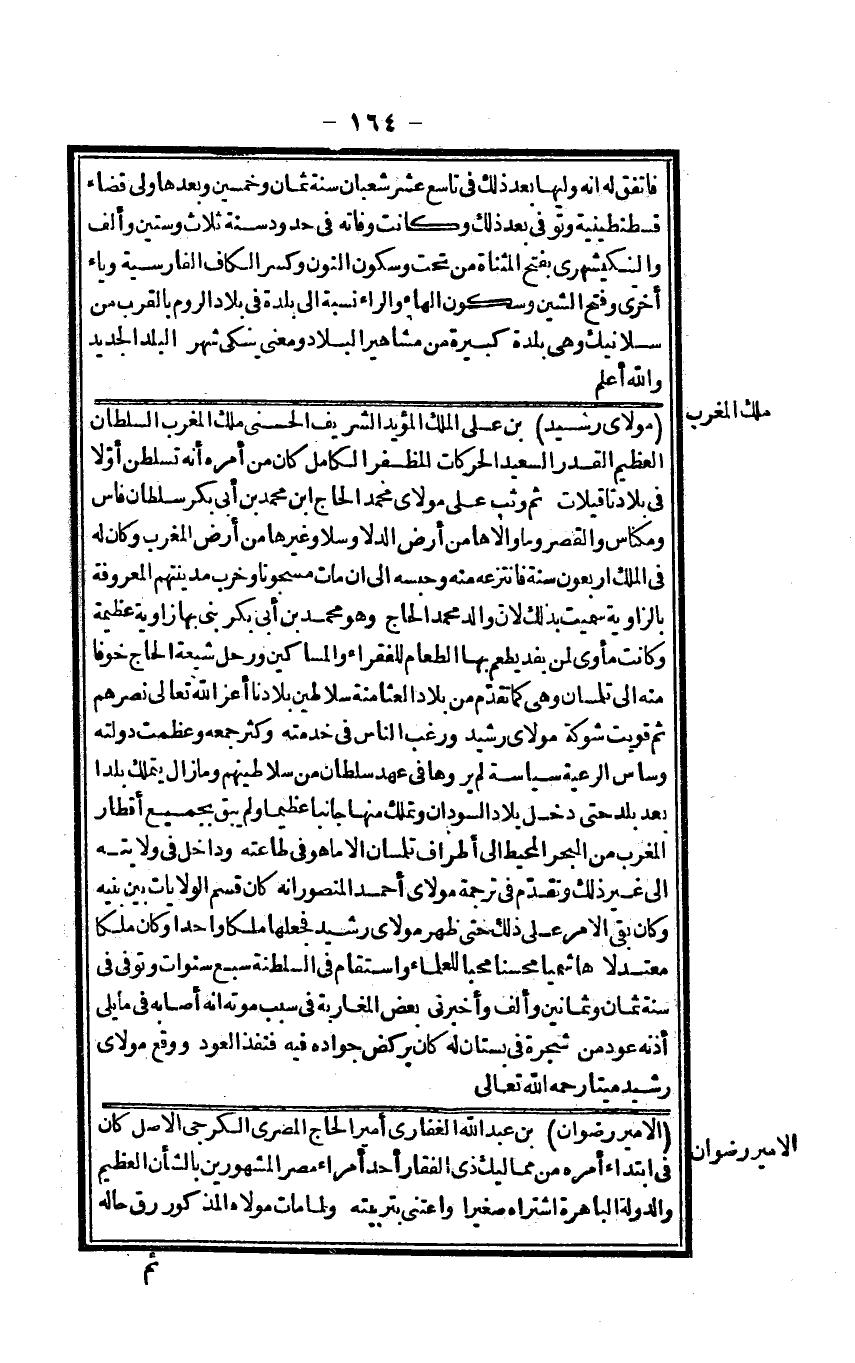 مولَايَ رشيد بن عَليّ الْملك الْمُؤَيد الشريف الْحسنى ملك الْمغرب السُّلْطَان الْعَظِيم الْقدر السعيد الحركات المظفر الْكَامِل كَانَ من أمره أَنه تسلطن أَولا فِي بِلَاد تاقيلات ثمَّ وثب على مولَايَ مُحَمَّد الْحَاج ابْن مُحَمَّد بن أبي بكر سُلْطَان فاس ومكناس وَالْقصر وَمَا والاها من أَرض الدلا وسلا وَغَيرهَا من أَرض الْمغرب وَكَانَ لَهُ فِي الْملك أَرْبَعُونَ سنة فانتزعه مِنْهُ وحبسه إِلَى أَن مَاتَ مسجونا وَخرب مدينتهم الْمَعْرُوفَة بالزاوية سميت بذلك لِأَن وَالِد مُحَمَّد الْحَاج وَهُوَ مُحَمَّد بن أبي بكر بنى بهَا زَاوِيَة عَظِيمَة وَكَانَت مأوى لمن يفد يطعم بهَا الطَّعَام للْفُقَرَاء وَالْمَسَاكِين ورحل شيعَة الْحَاج خوفًا مِنْهُ إِلَى تلمسان وَهِي كَمَا تقدم من بِلَاد العثامنة سلاطين بِلَادنَا أعز الله تَعَالَى نَصرهم ثمَّ قويت شَوْكَة مولَايَ رشيد وَرغب النَّاس فِي خدمته وَكثر جمعه وعظمت دولته وساس الرّعية سياسة لم يروها فِي عهد سُلْطَان من سلاطينهم وَمَا زَالَ يتَمَلَّك بَلَدا بعد بلد حَتَّى دخل بِلَاد السودَان وتملك مِنْهَا جانبا عَظِيما وَلم يبْق بِجَمِيعِ أقطار الْمغرب من الْبَحْر الْمُحِيط إِلَى أَطْرَاف تلمسان إِلَّا مَا هُوَ فِي طَاعَته وداخل فِي ولَايَته إِلَى غير ذَلِك وَتقدم فِي تَرْجَمَة مولَايَ أَحْمد الْمَنْصُور أَنه كَانَ قسم الولايات بَين بنيه وَكَانَ بَقِي الْأَمر على ذَلِك حَتَّى ظهر مولَايَ رشيد فَجَعلهَا ملكا وَاحِدًا وَكَانَ ملكا معتدلا هاشميا محسنا محبا للْعُلَمَاء واستقام فِي السلطنة سبع سنوات وَتُوفِّي فِي سنة ثَمَان وَثَمَانِينَ وَألف وَأَخْبرنِي بعض المغاربة فِي سَبَب مَوته أَنه أَصَابَهُ فِي مَا يَلِي أُذُنه عود من شَجَرَة فِي بُسْتَان لَهُ كَانَ يرْكض جَوَاده فِيهِ فنفذ الْعود وَوَقع مولَايَ رشيد مَيتا رَحمَه الله تَعَالَى