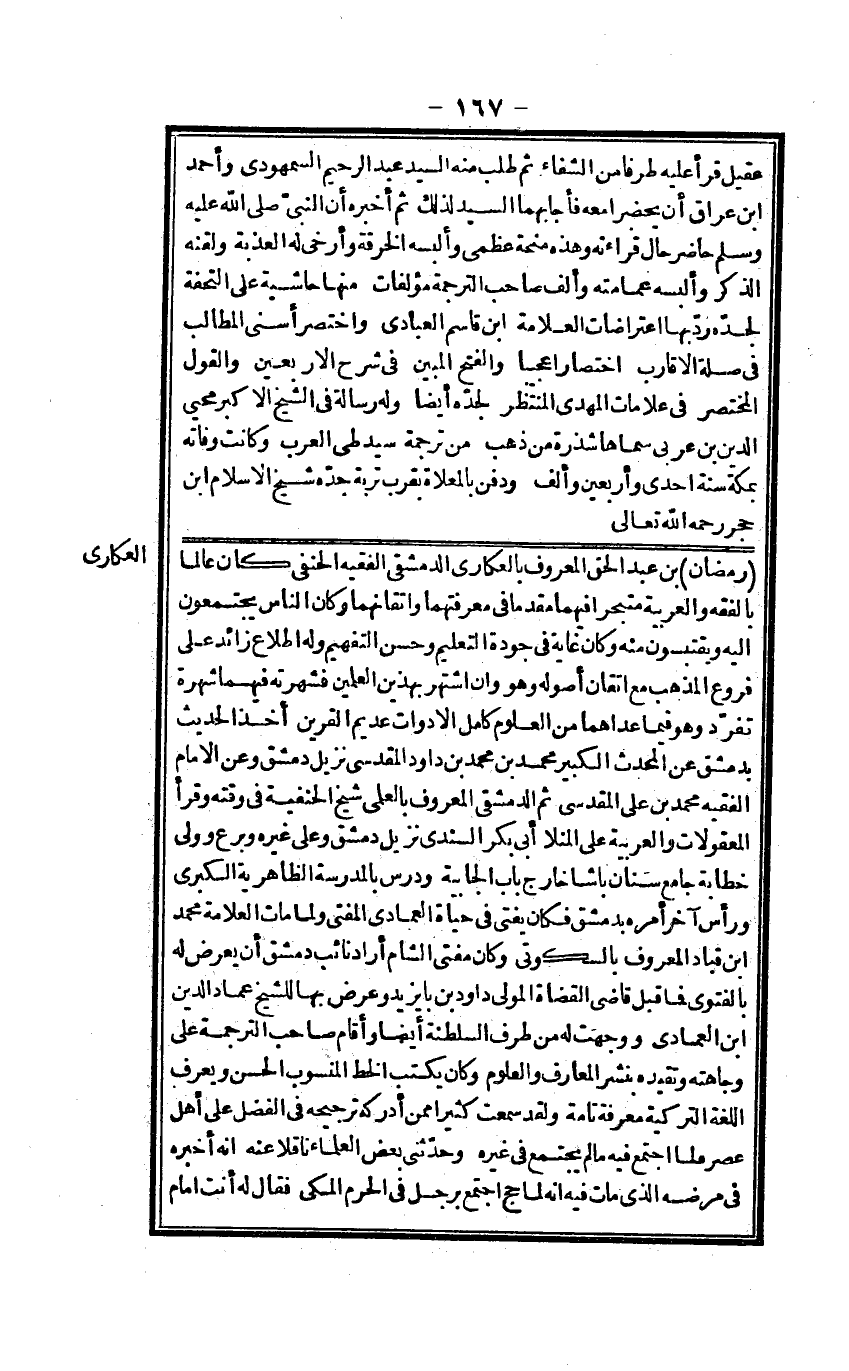 رَمَضَان بن عبد الْحق الْمَعْرُوف بالعكاري الدِّمَشْقِي الْفَقِيه الْحَنَفِيّ كَانَ عَالما بالفقه والعربية متجرا فيهمَا مقدما فِي معرفتهما وإتقانهما وَكَانَ النَّاس يَجْتَمعُونَ إِلَيْهِ ويقتبسون مِنْهُ وَكَانَ غَايَة فِي جودة التَّعْلِيم وَحسن التفهيم وَله إطلاع زَائِد على فروع الْمَذْهَب مَعَ إتقان أُصُوله وَهُوَ وَإِن اشْتهر بِهَذَيْنِ العلمين فشهرته فيهمَا شهرة تفرد وَهُوَ قيمًا عداهما من الْعُلُوم كَامِل الأدوات عديم القرين أَخذ الحَدِيث بِدِمَشْق عَن الْمُحدث الْكَبِير مُحَمَّد بن مُحَمَّد بن دَاوُد الْمَقْدِسِي نزيل دمشق وَعَن الإِمَام الْفَقِيه مُحَمَّد بن عَليّ الْمَقْدِسِي ثمَّ الدِّمَشْقِي الْمَعْرُوف بالعلمي شيخ الْحَنَفِيَّة فِي وقته وَقَرَأَ المعقولات والعربية على المنلا أبي بكر السندي نزيل دمشق وعَلى غَيره وبرع وَولي خطابة جَامع سِنَان باشا خَارج بَاب الْجَابِيَة ودرس بِالْمَدْرَسَةِ الظَّاهِرِيَّة الْكُبْرَى وَرَأس آخر أمره بِدِمَشْق فَكَانَ يُفْتِي فِي حَيَاة الْعِمَادِيّ الْمُفْتِي وَلما مَاتَ الْعَلامَة مُحَمَّد ابْن قباد الْمَعْرُوف بالسكوتي وَكَانَ مفتي الشَّام أَرَادَ نَائِب دمشق أَن يعرض لَهُ بالفتوى فَمَا قبل القَاضِي الْقُضَاة الْمولى دَاوُد بن بايزيد وَعرض بهَا للشَّيْخ عماد الدّين ابْن الْعِمَادِيّ ووجهت لَهُ من طرف السلطنة أَيْضا وَأقَام صَاحب التَّرْجَمَة على وجاهته وتقيده بنشر المعارف والعلوم وَكَانَ يكْتب الْخط الْمَنْسُوب الْحسن وَيعرف اللُّغَة التركية معرفَة تَامَّة وَلَقَد سَمِعت كثيرا مِمَّن أدْركهُ تَرْجِيحه فِي الْفضل على أهل عصر فَلَمَّا اجْتمع فِيهِ مَا لم يجْتَمع فِي غَيره وحَدثني بعض الْعلمَاء نَاقِلا عَنهُ أَنه أخبرهُ فِي مَرضه الَّذِي مَاتَ فِيهِ أَنه لما حج اجْتمع بِرَجُل فِي الْحرم الْمَكِّيّ فَقَالَ لَهُ أَنْت إِمَام