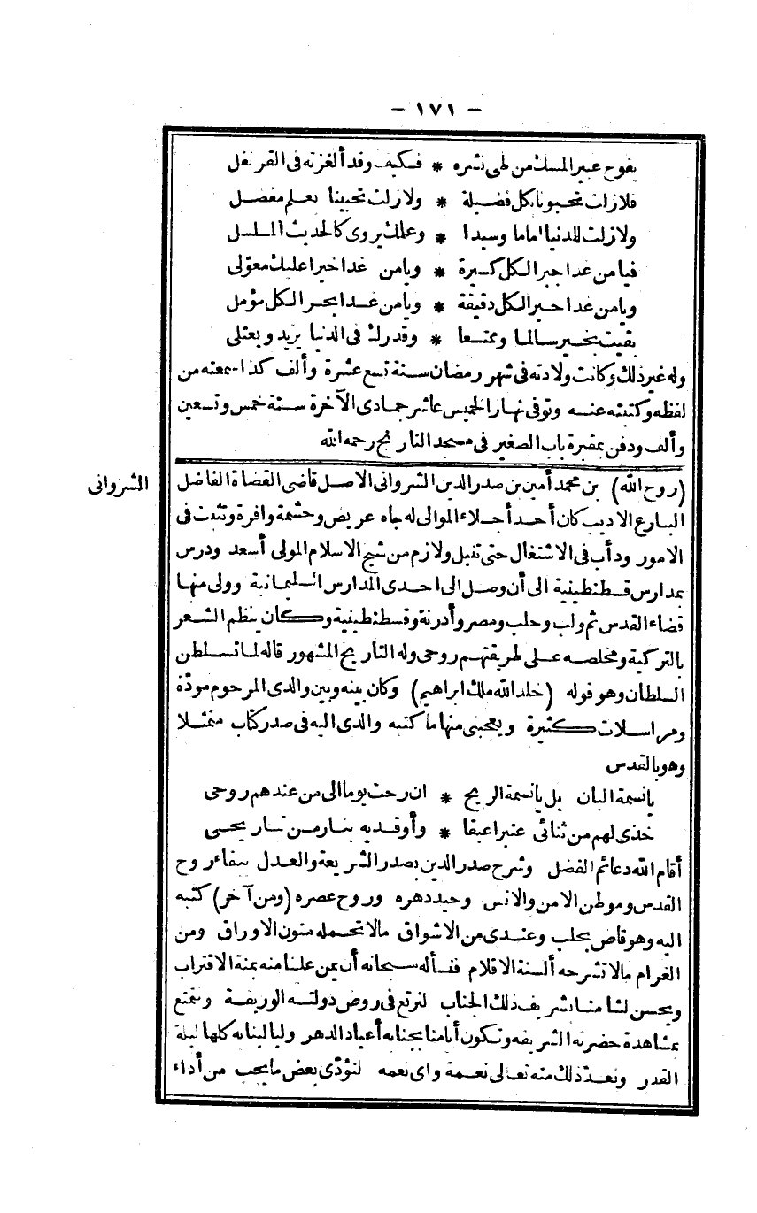 روح الله بن مُحَمَّد أَمِين بن صدر الدّين الشرواني الأَصْل قَاضِي الْقُضَاة الْفَاضِل البارع الأديب كَانَ أحد أجلاء الموَالِي لَهُ جاه عريض وحشمة وافرة وَتثبت فِي الْأُمُور ودأب فِي الإشتغال حَتَّى تنبل ولازم من شيخ الْإِسْلَام الْمولى أسعد ودرس بمدارس قسطنطينية إِلَى أَن وصل إِلَى أحدى الْمدَارِس السليمانية وَولي مِنْهَا قَضَاء الْقُدس ثمَّ ولب وحلب ومصر وأدرنة وقسطنطينية وَكَانَ ينظم الشّعْر بالتركية ومخلصه على طريقتهم روحي وَله التَّارِيخ الْمَشْهُور قَالَه لما تسلطن السُّلْطَان وَهُوَ قَوْله خلد الله ملك إِبْرَاهِيم وَكَانَ بَينه وَبَين وَالِدي المرحوم مَوَدَّة ومراسلات كَثِيرَة ويعجبني مِنْهَا مَا كتبه وَالِدي إِلَيْهِ فِي صدر كتاب متمثلا وَهُوَ بالقدس