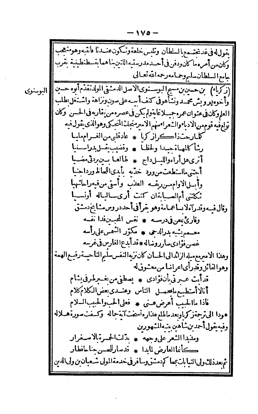 زَكَرِيَّاء بن حُسَيْن بن مسيح البوسنوي الأَصْل الدِّمَشْقِي المولد تقدم أَبوهُ حُسَيْن وَأَخُوهُ درويش مُحَمَّد وَنَشَأ هُوَ فِي كنف أَبِيه على صون ونزاهة واشتغل بِطَلَب الْعلم وَكَانَ فِي عنوان عمره جميلا غَايَة وَلم يكن فِي عصره من يُقَارِبه فِي الْحسن وَكَانَ تولع فِيهِ قوم من الأدباء والشعرء مِنْهُم الْأَمِير منجك المنجكي وَهُوَ الَّذِي يَقُول فِيهِ