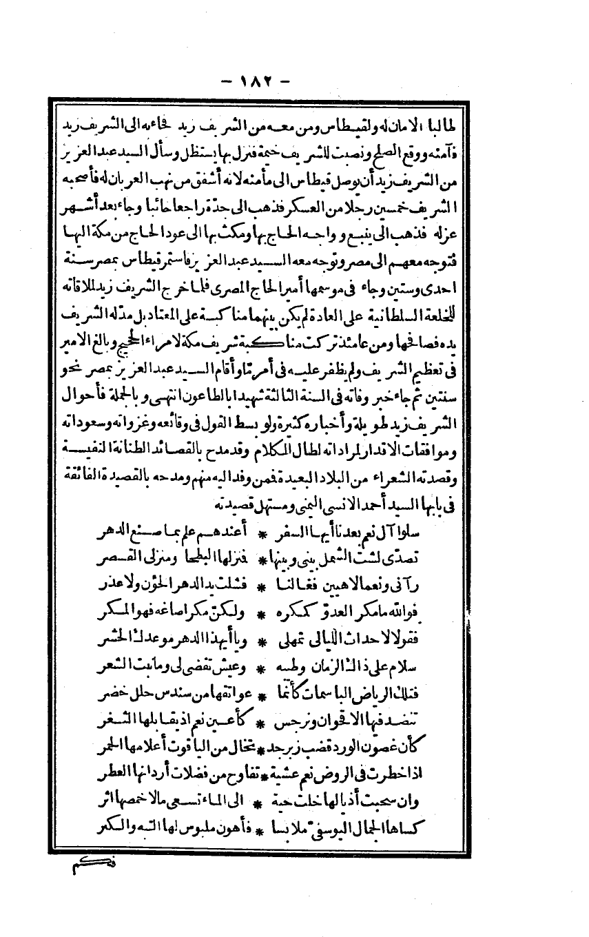 طَالبا الْأمان لَهُ ولقيطاس وَمن مَعَه من الشريف زيد فجَاء بِهِ إِلَى الشريف زيد فآمنه وَوَقع الصُّلْح ونصبت للشريف خيمة فَنزل بهَا يستظل وَسَأَلَ السَّيِّد عبد الْعَزِيز من الشريف زيد أَن يُوصل قيطاس إِلَى مأمنه لِأَنَّهُ أشْفق من نهب العربان لَهُ فأصحبه الشريف خمسين رجلا من الْعَسْكَر فَذهب إِلَى جدة رَاجعا خائباً وَجَاء بعد أشهر عَزله فَذهب إِلَى يَنْبع وواجه الْحَاج وَبهَا وَمكث بهَا إِلَى عود الْحَاج من مَكَّة إِلَيْهَا فَتوجه مَعَهم إِلَى مصر وَتوجه مَعَه السَّيِّد عبد الْعَزِيز فاستمر قيطاس بِمصْر سنة إِحْدَى وَسِتِّينَ وَجَاء فِي موسمها أَمِير الْحَاج الْمصْرِيّ فَلَمَّا خرج الشريف زيد لملاقاته للخلعة السُّلْطَانِيَّة على الْعَادة لم يكن بَينهمَا مناكبة على الْمُعْتَاد بل مد لَهُ الشريف يَده فصافحها وَمن عامئذ تركت مناكبة شرِيف مَكَّة لأمراء الحجيج وَبَالغ الْأَمِير فِي تَعْظِيم الشريف وَلم يظفر عَلَيْهِ فِي أمرما وَأقَام السَّيِّد عبد الْعَزِيز بِمصْر نَحْو سنتَيْن ثمَّ جَاءَ خبر وَفَاته فِي السّنة الثَّالِثَة شَهِيدا بالطاعون وانْتهى وَبِالْجُمْلَةِ فأحوال الشريف زيد طَوِيلَة وأخباره كَثِيرَة وَلَو بسط القَوْل فِي وقائعه وغزواته وسعوداته وموافقات الأقدار لمراداته لطال الْكَلَام وَقد مدح بالقصائد الطنانة النفيسة وقصدته الشُّعَرَاء من الْبِلَاد الْبَعِيدَة فَمن وَفد إِلَيْهِم مِنْهُم ومدحه بالقصيدة الفائقة فِي بَابهَا السَّيِّد أَحْمد الأنسي اليمني ومستهل قصيدته