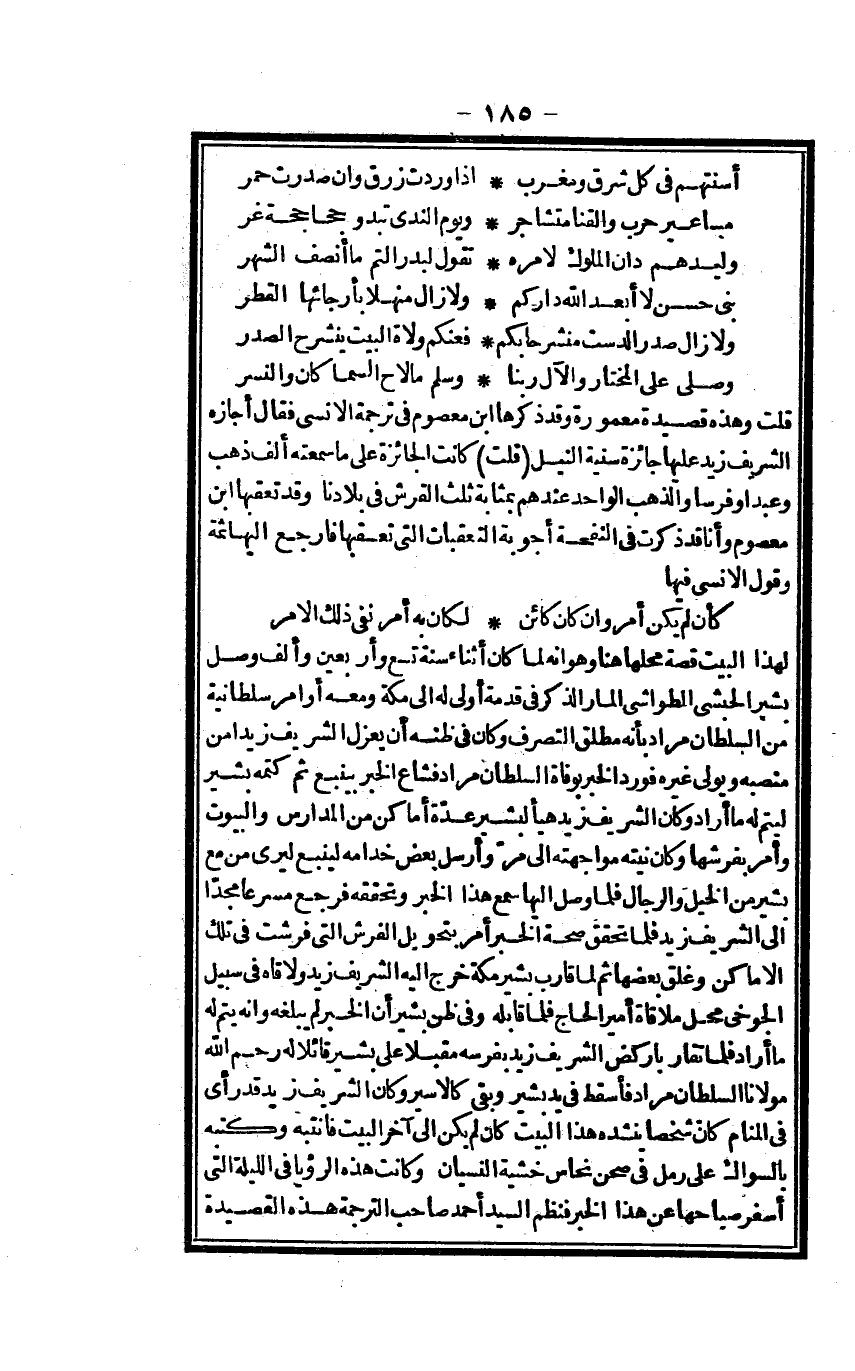 قلت وَهَذِه قصيدة معمورة وَقد ذكرهَا ابْن مَعْصُوم فِي تَرْجَمَة الأنسي فَقَالَ أجَازه الشريف زيد عَلَيْهَا جَائِزَة سنية النّيل قلت كَانَت الْجَائِزَة على مَا سمعته ألف ذهب وعبداً وفرسا وَالذَّهَب الْوَاحِد عِنْدهم بِمَثَابَة ثلث القرش فِي بِلَادنَا وَقعد تعقبها ابْن مَعْصُوم وَأَنا قد ذكرت فِي النفحة أجوبة التعقبات الَّتِي تعقبها فَارْجِع إِلَيْهَا ثمَّة وَقَول الأنسي فِيهَا