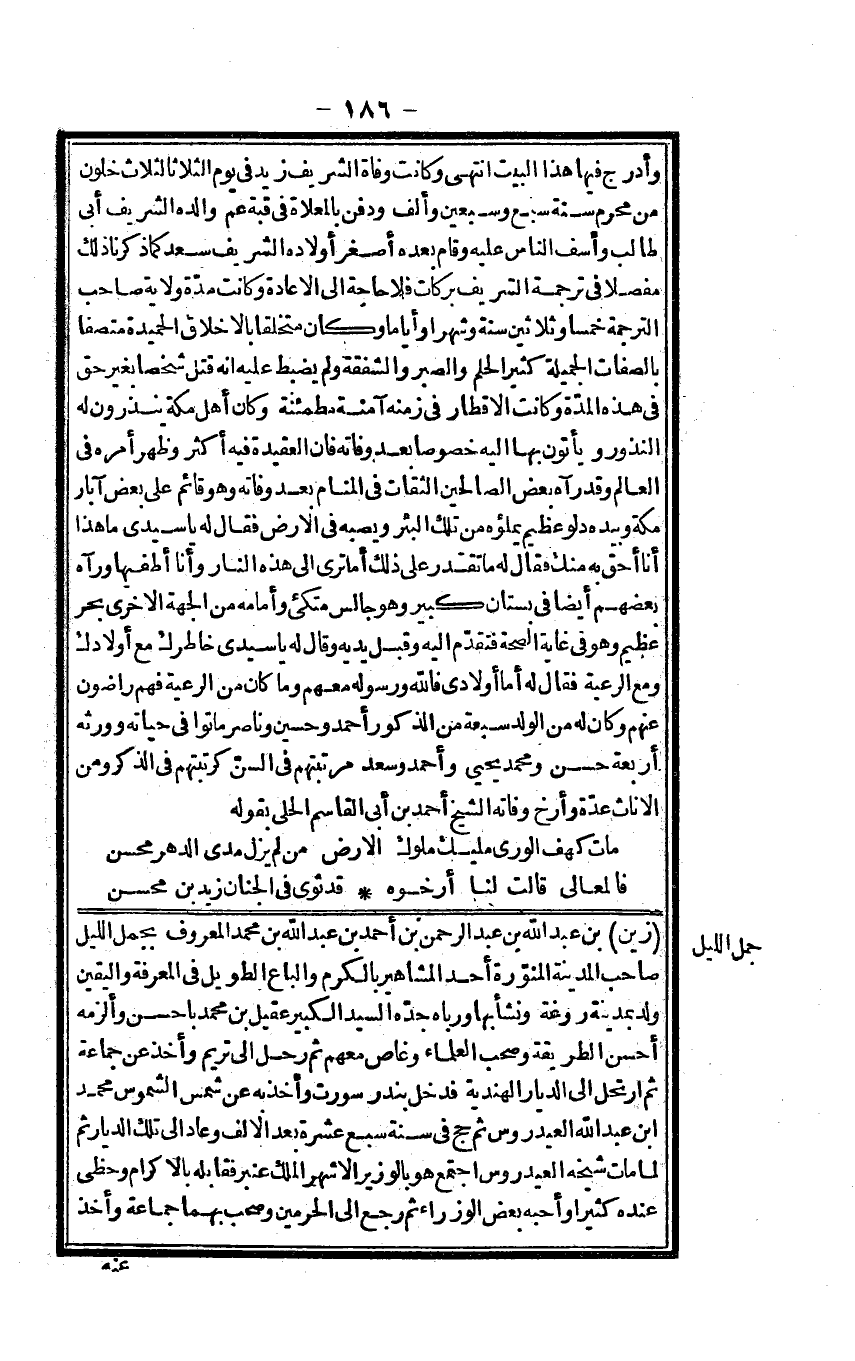 زين بن عبد الله بن عبد الرَّحْمَن بن أَحْمد بن عبد الله بن مُحَمَّد الْمَعْرُوف بِجعْل اللَّيْل صَاحب الْمَدِينَة المنورة أحد الْمَشَاهِير بِالْكَرمِ والباع الطَّوِيل فِي الْمعرفَة وَالْيَقِين ولد بِمَدِينَة روغة وَنَشَأ بهَا ورباه جده السَّيِّد الْكَبِير عقيل بن مُحَمَّد باحسن وألزمه أحسن الطَّرِيقَة وَصَحب الْعلمَاء وغاص مَعَهم ثمَّ رَحل إِلَى تريم وَأخذ عَن جمَاعَة ثمَّ ارتحل إِلَى الديار الْهِنْدِيَّة فَدخل بندر سورت وَأخذ بِهِ عَن شمس الشموس مُحَمَّد ابْن عبد الله العيدروس ثمَّ حج سنة سبع عشرَة بعد الْألف وَعَاد إِلَى تِلْكَ الديار ثمَّ لما مَاتَ شَيْخه العيدروس اجْتمع هُوَ بالوزير الْأَشْهر الْملك عنبر فقابله بالاكرام وحظى عِنْده كثيرا وأحبه بعض الوزراء ثمَّ رَجَعَ إِلَى الْحَرَمَيْنِ وَصَحب بهما جمَاعَة وَأخذ