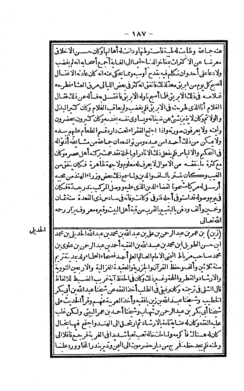 زين بن عمر بن عبد الرَّحْمَن بن عَليّ بن عبد الله بن مُحَمَّد بن عبد الله الحديلي بن مُحَمَّد ابْن حسن الطَّوِيل ابْن مُحَمَّد بن عبد الله بن الْفَقِيه أَحْمد بن عبد الرَّحْمَن بن علوي بن مُحَمَّد صَاحب مرباط اليمني الإِمَام الْعَالم الْعلم أحد فصحاء الْعلمَاء ولد بِمَدِينَة تريم سنة ثَلَاثِينَ وَألف وَحفظ الْقُرْآن والجزرية والعقيدة الغزالية وَالْأَرْبَعِينَ النووية والإرشاد والقطر والملحة وَغير ذَلِك وَكَانَ فِي الْحِفْظ آيَة غَرِيب الضَّبْط للألفاظ قَالَ الشلي فِي تَرْجَمته وَكَانَ رفيقي فِي الطّلب أَخذ الْفِقْه عَن شَيخنَا عبد الله بن أبي بكر الْخَطِيب وَشَيخنَا عبد الله بن زين بافقيه وَأخذ الْعَرَبيَّة عَنْهُم وَقَرَأَ الحَدِيث على شَيخنَا أبي بكر بن عبد الرَّحْمَن بن شهَاب وَشَيخنَا أَحْمد بن عمر البيتي وَلَكِن غلب عَلَيْهِ الْفِقْه وَكَانَ لَهُ عناية تَامَّة بالإرشاد ثمَّ ارتحل إِلَى الْهِنْد وَاجْتمعَ فِيهَا بخال كَانَ لَهُ هُنَاكَ فَأكْرمه وَلما مَاتَ خَاله تَعب تعباً شَدِيدا فِي الغربة فَرجع قَافِلًا إِلَى وَطنه فَلم يجد حَظه فَخرج من ديار حَضرمَوْت إِلَى الْيمن وتدبر بندر المخاو ورد علينا