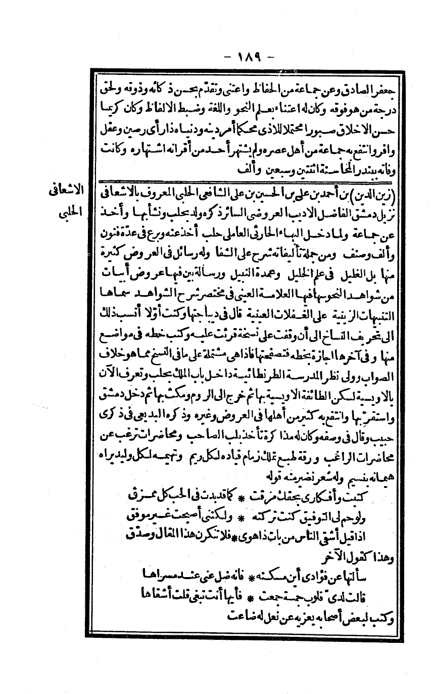زين الدّين بن أَحْمد بن عَليّ بن الْحُسَيْن بن عَليّ الشَّافِعِي الْحلَبِي الْمَعْرُوف بالأشعافي نزيل دمشق الْفَاضِل الأديب الْعَرُوضِي السائر ذكره ولد بحلب وَنَشَأ بهَا وَأخذ عَن جمَاعَة وَلما دخل الْبَهَاء الْحَارِثِيّ العاملي حلب أَخذ عَنهُ وبرع فِي عدَّة فنون وَألف وصنف وَمن جملَة تأليفاته شرح عَليّ الشفا وَله رسائل فِي الْعرُوض كَثِيرَة مِنْهَا بل الْقَلِيل فِي علم الْخَلِيل وعمدة النَّبِيل ورسالة بَين فِيهَا عرُوض أَبْيَات من شَوَاهِد النَّحْو سَهَا فِيهَا الْعَلامَة الْعَيْنِيّ فِي مُخْتَصر شرح الشواهد سَمَّاهَا التَّنْبِيهَات الزينية على الغفلات العينية قَالَ فِي ديباجتها وَكنت أَولا أنسب ذَلِك إِلَى تَحْرِيف النساخ إِلَى أَن وقفت على نُسْخَة قُرِئت عَلَيْهِ وَكتب خطه فِي مَوَاضِع مِنْهَا وَفِي آخرهَا إجَازَة بِخَطِّهِ فتصفحتها فَإِذا هِيَ مُشْتَمِلَة على مَا فِي النّسخ مِمَّا هُوَ خلاف الصَّوَاب وَولي نظر الْمدرسَة الطرنطائية دَاخل بَاب الْملك بحلب وتعرف الْآن بالأويسية لسكن الطَّائِفَة الاويسية بهَا ثمَّ خرج إِلَى الرّوم وَمكث بهَا ثمَّ دخل دمشق وَاسْتقر بهَا وانتفع بِهِ كثير من أَهلهَا فِي الْعرُوض وَغَيره وَذكره البديعي فِي ذكرى حبيب وَقَالَ فِي وَصفه وَكَانَ لَهُ مذاكرة تَأْخُذ بلب الصاحب ومحاضرات ترغب عَن محاضرات الرَّاغِب ورقة طبع تملك زِمَام قياده لكل ريم وتهيمه لكل وليديراه هيمانه بنسيم وَله شعر نضير مِنْهُ قَوْله