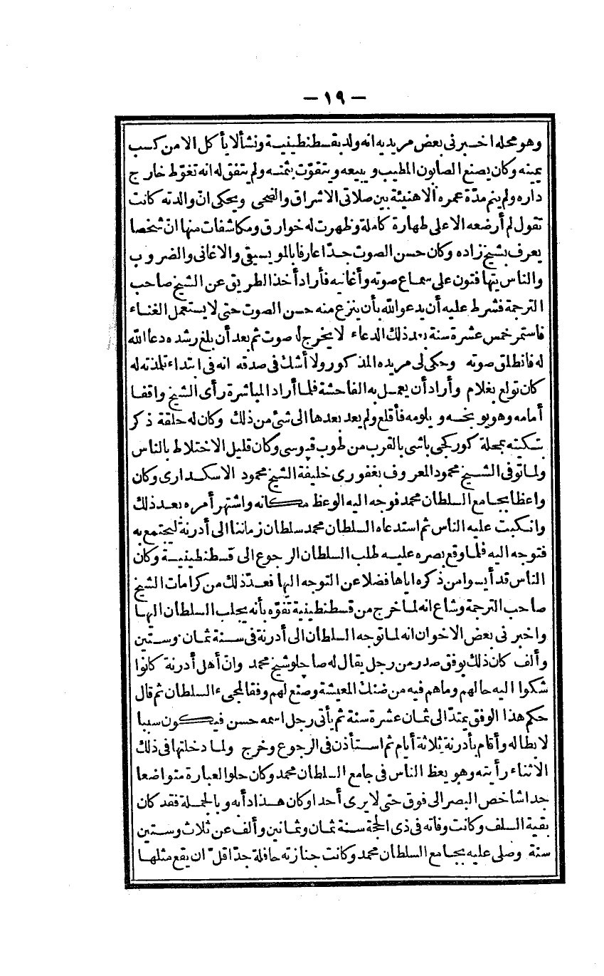 وَهُوَ مَحَله أَخْبرنِي بعض مر يَدَيْهِ أَنه ولد بقسطنطينية وَنَشَأ لَا يَأْكُل إِلَّا من كسب يَمِينه وَكَانَ يصنع الصابون المطيب ويبيعه ويتقوت بِثمنِهِ وَلم يتَّفق لَهُ أَنه تغوط خَارج دَاره وَلم ينم مُدَّة عمره إِلَّا هنيئة بَين صَلَاتي الْإِشْرَاق والضخى ويحكى أَن والدته كَانَت تَقول لم أرضعه إِلَّا على طَهَارَة كَامِلَة وَظَهَرت لَهُ خوارق ومكاشفات مِنْهَا أَن شخصا يعرف بشيخ زَاده وَكَانَ حسن الصَّوْت جدا عَارِفًا بالموسيقى والأغاني والضروب وَالنَّاس يتهافتون على سَماع صَوته وأغانيه فَأَرَادَ أَخذ الطَّرِيق عَن الشَّيْخ صَاحب التَّرْجَمَة فَشرط عَلَيْهِ أَن يَدْعُو الله بِأَن ينْزع مِنْهُ حسن الصَّوْت حَتَّى لَا يسْتَعْمل الْغناء فاستمر خمس عشرَة سنة بعد ذَلِك الدُّعَاء لَا يخرج لَهُ صَوت ثمَّ بعد أَن بلغ رشده دَعَا الله لَهُ فَانْطَلق صَوته وَحكى لَهُ مريده الْمَذْكُور وَلَا أَشك فِي صدقه أَنه فِي ابْتِدَاء تلمذته لَهُ كَانَ تولع بِغُلَام وَأَرَادَ أَن يعْمل بِهِ الْفَاحِشَة فَلَمَّا أَرَادَ الْمُبَاشرَة رَأْي الشَّيْخ وَاقِفًا أَمَامه وَهُوَ يوبخه ويلومه فأقلع وَلم يعد بعْدهَا إِلَى شَيْء من ذَلِك وَكَانَ لَهُ حَلقَة ذكر بتكيته بمحلة كور كجي باشي بِالْقربِ من طوب قبوسي وَكَانَ قَلِيل الِاخْتِلَاط بِالنَّاسِ وَلما توفّي الشَّيْخ مَحْمُود الْمَعْرُوف بغفوري خَليفَة الشَّيْخ مَحْمُود الأسكدراي وَكَانَ واعظا بِجَامِع السُّلْطَان مُحَمَّد فَوجه إِلَيْهِ الْوَعْظ مَكَانَهُ واشتهر أمره بعد ذَلِك وانكبت عَلَيْهِ النَّاس ثمَّ استدعاه السُّلْطَان مُحَمَّد سُلْطَان زَمَاننَا إِلَى أدرنة ليجتمع بِهِ فَتوجه إِلَيْهِ فَلَمَّا وَقع بَصَره عَلَيْهِ طلب السُّلْطَان الرُّجُوع إِلَى قسطنطينية وَكَانَ النَّاس قد أيسوا من ذكره إِيَّاهَا فضلا عَن التَّوَجُّه إِلَيْهَا فعدد ذَلِك من كرامات الشَّيْخ صَاحب التَّرْجَمَة وشاع أَنه لما خرج من قسطنطينية تفوه بِأَنَّهُ يجلب السُّلْطَان إِلَيْهَا وَأَخْبرنِي بعض الإخوان أَنه لما توجه السُّلْطَان إِلَى أدرنة فِي سنة ثَمَان وَسِتِّينَ وَألف كَانَ ذَلِك بوفق صدر من رجل يُقَال لَهُ صاجلوشج مُحَمَّد وَأَن أهل أدرنة كَانُوا شكوا إِلَيْهِ حَالهم وَمَا هم فِيهِ من ضنك الْمَعيشَة وصنع لَهُم وفقا لمجيء السُّلْطَان ثمَّ قَالَ حكم هَذَا الوفق يَمْتَد إِلَى ثَمَان عشرَة سنة ثمَّ يَأْتِي رجل اسْمه حسن فَيكون سَببا لأبطاله وَأقَام بأدرنة ثَلَاثَة أَيَّام ثمَّ اسْتَأْذن فِي الرُّجُوع وَخرج وَلما دَخَلتهَا فِي ذَلِك الْأَثْنَاء رَأَيْته وَهُوَ يعظ النَّاس فِي جَامع السُّلْطَان مُحَمَّد وَكَانَ حُلْو الْعبارَة متواضعا جدا أشاخص الْبَصَر إِلَى فَوق حَتَّى لَا يرى أحدا وَكَانَ هَذَا دأبه بِالْجُمْلَةِ فقد كَانَ بَقِيَّة السّلف وَكَانَت وَفَاته فِي ذِي الْحجَّة سنة ثَمَان وَثَمَانِينَ وَألف عَن ثَلَاث وَسِتِّينَ سنة وَصلى عَلَيْهِ بِجَامِع السُّلْطَان مُحَمَّد وَكَانَت جنَازَته حافلة جدا قل أَن يَقع مثلهَا