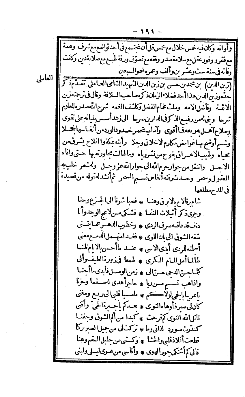 زين الدّين بن مُحَمَّد بن حسن بن زين الدّين الشَّهِيد الشَّامي العاملي تقدم ذكر جده وزين الدّين هَذَا أحد فضلاء الزَّمَان ذكره صَاحب السلافة وَقَالَ فِي تَرْجَمته زين الْأَئِمَّة وفاضل الْأمة وملث غمام الْفضل وَكَاشف الْغُمَّة شرح الله صَدره للعلوم شرحا وَبنى لَهُ من رفيع الذّكر فِي الدَّاريْنِ صرحا إِلَى زهد أسس بُنْيَانه على تقوى وَصَلَاح آهل بِهِ ربعه فَمَا أقوى وآداب تحمر خدود الْورْد من أنفاسها خجلا وشيم أوضح بهَا غوامض مَكَارِم الْأَخْلَاق وجلا رَأَيْته بِمَكَّة والفلاح يشرق من محياه وَطيب الأعراق يفوح من نشر رياه وَمَا طَالَتْ مجاورته بهَا حَتَّى وافاه الْأَجَل وانتقل من جوَار حرم الله إِلَى جوَار الله عز وَجل وَله شعر خلب بِهِ الْعُقُول وسحر وحسدت رقته أنفاس نسيم السحر ثمَّ أنْشد لَهُ قَوْله من قصيدة فِي الْمَدْح مطْلعهَا