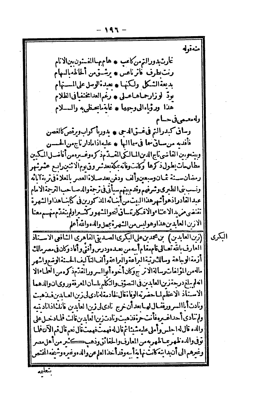 زين العابدين بن مُحَمَّد بن عَليّ الْبكْرِيّ الصديقي القاهري الشَّافِعِي الْأُسْتَاذ الْعَارِف بِاللَّه تَعَالَى قَامَ مقَام أَبِيه من بعده ودرس وَأفْتى وَأفَاد وَكَانَ فِي مصر مَالك أزمة الوجاهة وسالك رُتْبَة البراعة واليراعة وَألف التآليف الْحَسَنَة الْوَضع وَأشهر مَاله من المؤلفات رِسَالَة إِلَّا ترج وَكَانَ أَخُوهُ أَبُو السرُور الْمُقدم ذكره من الْعلمَاء إِلَّا أَنه لم يبلغ دَرَجَة زين العابدين فِي التصوف والتكلم بِلِسَان الْمعرفَة وروى أَن والدهما الْأُسْتَاذ الْأَعْظَم لما حَضرته الْوَفَاة قَالَ لخادمة لَهُ نَادَى لي زين العابدين فَذَهَبت وَنَادَتْ ابا السرُور فَقَالَ لَهَا بعد أَن خرج نَادِي لي زين العابدين فأنك إِذا ناديتيه وَلم تنادى أحدا غَيره فَأَنت حرَّة فَذَهَبت وَنَادَتْ زين العابدين قَالَت فَلَمَّا دخل على وَالِدَة قَالَ لَهُ اجْلِسْ وأملى عَلَيْهِ شيثا ثمَّ قَالَ لَهُ فهمت فهمت قَالَ نعم قَالَ قُم الْآن فَلَمَّا توفّي وَالِده ظهر بِمَا ظهر بِهِ من المعارف والحقائق وَذهب كثير من أهل مصر وَغَيرهم إِلَى أَن بدايته كَانَت نِهَايَة أَبِيه وَقد أَخذ الْعلم عَن وَالِده وَغَيره وَشَيْخه الْمُخْتَص