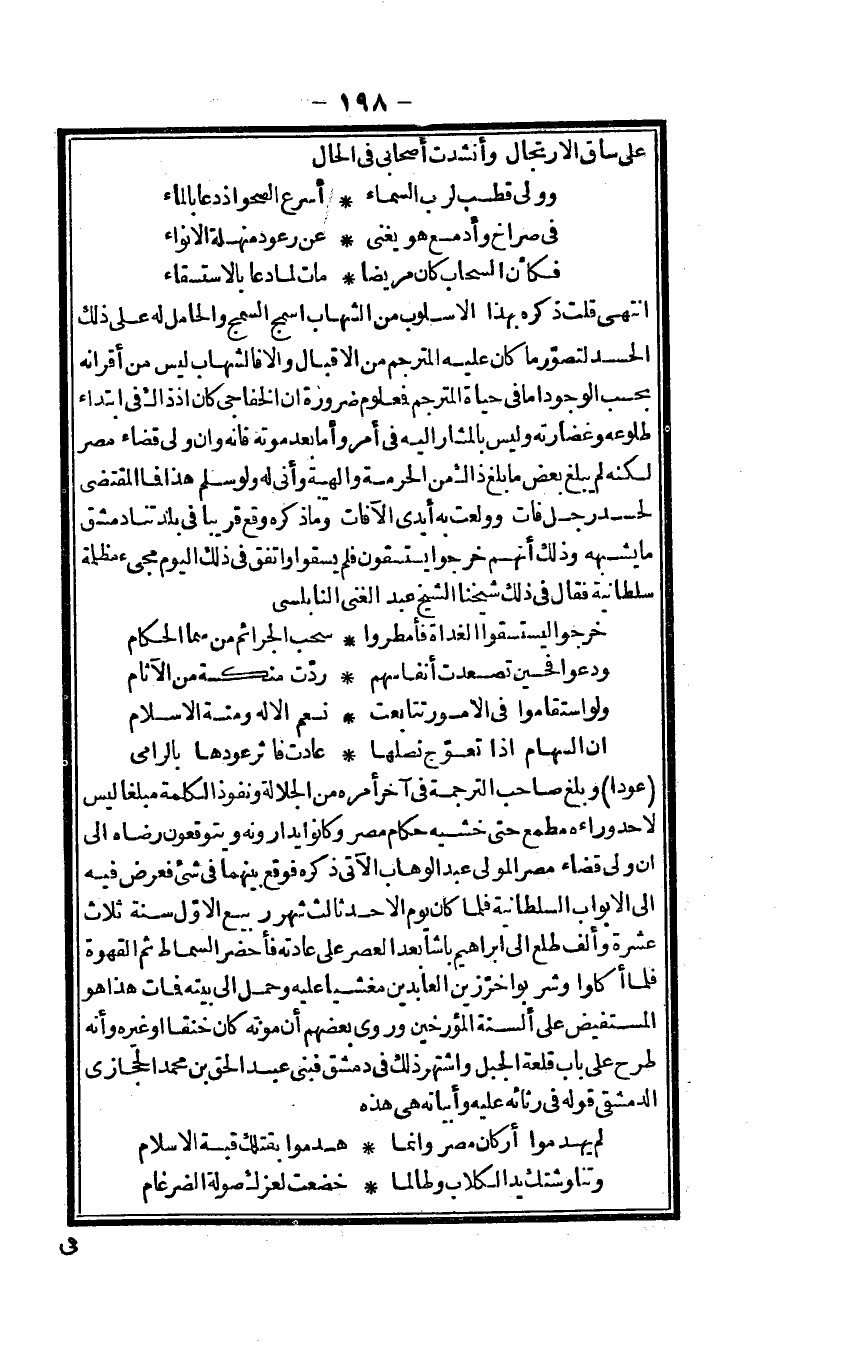 عودا وَبلغ صَاحب التَّرْجَمَة فِي آخر أمره من الْجَلالَة ونفوذ الْكَلِمَة مبلغا لَيْسَ لَا حد وَرَاءه مطمع حَتَّى خشيَة حكام مصر وَكَانُوا يدارونه ويتوقعون رِضَاهُ إِلَى أَن ولي قَضَاء مصر الْمولى عبد الْوَهَّاب الْآتِي ذكره فَوَقع بَينهمَا فِي شَيْء فَعرض فِيهِ إِلَى الْأَبْوَاب السُّلْطَانِيَّة فَلَمَّا كَانَ يَوْم الْأَحَد ثَالِث شهر ربيع الأول سنة ثَلَاث عشرَة وَألف طلع إِلَى إِبْرَاهِيم باشا بعد الْعَصْر على عَادَته فأحضر السماط ثمَّ القهوة فَلَمَّا أكلُوا وَشَرِبُوا خر زين العابدين مغشيا عَلَيْهِ وَحمل إِلَى بَيته فَمَاتَ هَذَا هُوَ المستفيض على أَلْسِنَة المؤرخين وروى بَعضهم أَن مَوته كَانَ خنقا أَو غَيره وَأَنه طرح على بَاب قلعة الْجَبَل واشتهر ذَلِك فِي دمشق فَبنى عبد الْحق بن مُحَمَّد الْحِجَازِي الدِّمَشْقِي قَوْله فِي رثائه عَلَيْهِ وأبياته هِيَ هَذِه