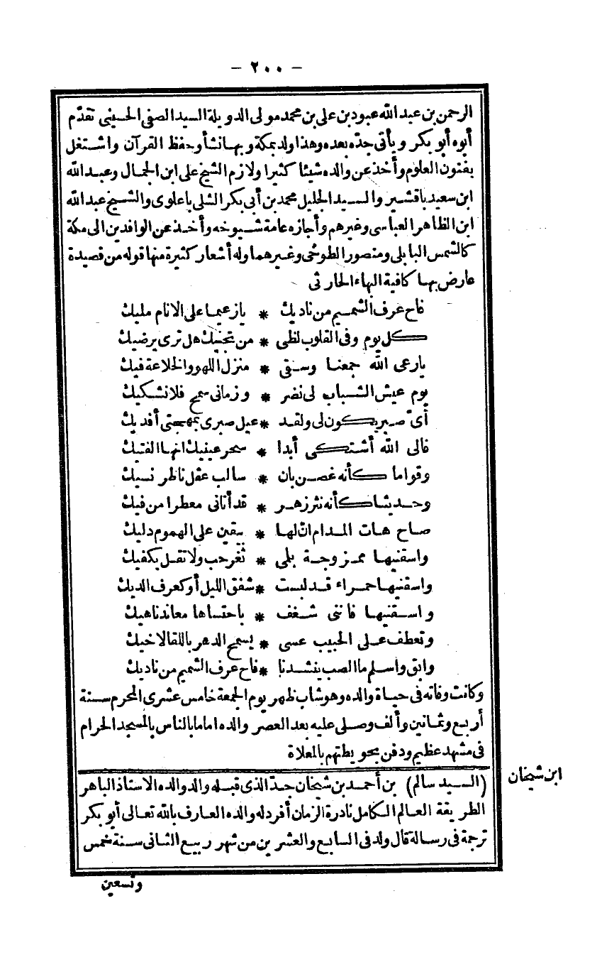 الرَّحْمَن بن عبد الله عبود بن عَليّ بن مُحَمَّد مولى الدويلة السَّيِّد الصفي الْحُسَيْنِي تقدم أَبوهُ أَبُو بكر وَيَأْتِي جده بعده وَهَذَا ولد بِمَكَّة وَبهَا نَشأ وَحفظ الْقُرْآن واشتغل بفنون الْعُلُوم وَأخذ عَن وَالِده شَيْئا كثيرا ولازم الشَّيْخ عَليّ ابْن الْجمال وَعبد الله ابْن سعيد باقشير وَالسَّيِّد الْجَلِيل مُحَمَّد بن أبي بكر الشلي باعلوي وَالشَّيْخ عبد الله ابْن الظَّاهِر العباسي وَغَيرهم وَأَجَازَهُ عَامَّة شُيُوخه وَأخذ عَن الوافدين إِلَى مَكَّة كَالشَّمْسِ البابلي وَمَنْصُور الطوخي وَغَيرهمَا وَله أشعار كَثِيرَة مِنْهَا قَوْله من قصيدة عَارض بهَا كَافِيَة الْبَهَاء الْحَارِثِيّ