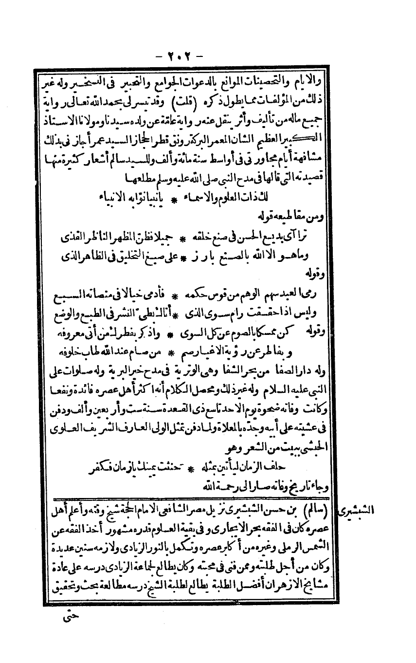 سَالم بن حسن الشبشيري نزيل مصر الشَّافِعِي الإِمَام الْحجَّة شيخ وقته وَأعلم أهل عصره كَانَ فِي الْفِقْه بَحر الإيجاري وَفِي بَقِيَّة الْعُلُوم قدره مَشْهُور أَخذ الْفِقْه عَن الشَّمْس الرَّمْلِيّ وَغَيره من أكَابِر عصره وتكمل بِالنورِ الزيَادي ولازمه سِنِين عديدة وَكَانَ من أجل طلبته وَمِمَّنْ فنى فِي محبته وَكَانَ يطالع لجَماعَة الزيَادي درسه على عَادَة مَشَايِخ الأزهران أفضل الطّلبَة يطالع لطلبة الشَّيْخ درسه مطالعة بحث وَتَحْقِيق