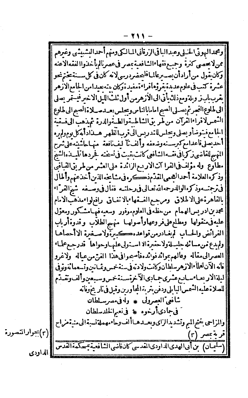 وَمُحَمّد البهوتي الْحَنْبَلِيّ وَعبد الْبَاقِي الزّرْقَانِيّ الْمَالِكِي وَمِنْهُم أَحْمد البشبيشي وَغَيرهم مِمَّن لَا يُحْصى كَثْرَة وَجَمِيع فُقَهَاء الشَّافِعِيَّة بِمصْر فِي عصرنا لم يَأْخُذُوا الْفِقْه إِلَّا عَنهُ وَكَانَ يَقُول من أَرَادَ أَن يصير عَالما فليحضر درسي لِأَنَّهُ كَانَ فِي كل سنة يخْتم نَحْو عشرَة كتب فِي عُلُوم عديدة يقْرؤهَا قِرَاءَة مفيدة وَكَانَ بَيته بَعيدا من الْجَامِع الْأَزْهَر بِقرب بَاب زويلة وَمَعَ ذَلِك يَأْتِي إِلَى الْأَزْهَر من أول ثلث اللَّيْل الْأَخير فيستمر يُصَلِّي إِلَى طُلُوع الْفجْر ثمَّ يُصَلِّي الصُّبْح إِمَامًا بِالنَّاسِ وَيجْلس بعد صَلَاة الصُّبْح إِلَى طُلُوع الشَّمْس لإقراء الْقُرْآن من طَرِيق الشاطبية والطيبة والدرة ثمَّ يذهب إِلَى فسقية الْجَامِع فيتوضأ وَيُصلي وَيجْلس للتدريس إِلَى قرب الظّهْر هَذَا دأبه كل يَوْم وَلم يره أحد يُصَلِّي قَاعِدا مَعَ كبر سنه وَضَعفه وَألف تآليف نافعة مِنْهَا حَاشِيَته على شرح الْمنْهَج للْقَاضِي زَكَرِيَّا فِي فقه الشَّافِعِي كَانَت بقيت فِي نسخته فجردها تِلْمِيذه الشَّيْخ مُطَاوع وَله مؤلف فِي القراآت الْأَرْبَع الزَّائِدَة على الْعشْر من طَرِيق القباقبي وَذكره الْعَلامَة أَحْمد العجمي الْمُقدم ذكره فِي مشايخه الَّذين أَخذ عَنْهُم وَأطَال فِي تَرْجَمته وَذكره الْوَالِد رَحمَه الله تَعَالَى فِي رحلته فَقَالَ فِي وَصفه شيخ الْقُرَّاء بِالْقَاهِرَةِ على الْإِطْلَاق ومرجع الْفُقَهَاء بالِاتِّفَاقِ رَافع لِوَاء مَذْهَب الإِمَام مُحَمَّد بن إِدْرِيس الْهمام من حَظه فِي الْعُلُوم موفور وسعيه فِيهَا مشكور ومعوّل عَلَيْهِ فِي منقولها ومطلع على فروعها وأصولها مَنْهَج الطلاب وقدوة أَرْبَاب الْفَرَائِض والحساب لم يُغَادر من قَوَاعِده كَبِيرَة وَلَا صَغِيرَة إِلَّا أحصاها وَلم يدع من مسَائِله جليلة وَلَا حقيرة إِلَّا استولى عَلَيْهَا وحواها قد رَجَعَ عُلَمَاء الْعَصْر إِلَى مقاله وعالهم بموائد فَوَائده فَأَصْبحُوا فِي هَذَا الْفَنّ من عِيَاله وَلَا غرو فَإِنَّهُ الْآن لعلماء الْأَزْهَر سُلْطَان وَكَانَت وِلَادَته فِي سنة خمس وَثَمَانِينَ وَتِسْعمِائَة وَتُوفِّي لَيْلَة الْأَرْبَعَاء سَابِع عشري جُمَادَى الْآخِرَة سنة خمس وَسبعين وَألف وَتقدم للصَّلَاة عَلَيْهِ الشَّمْس البابلي وَدفن بتربة المجاورين وَقيل فِي تَارِيخ وَفَاته