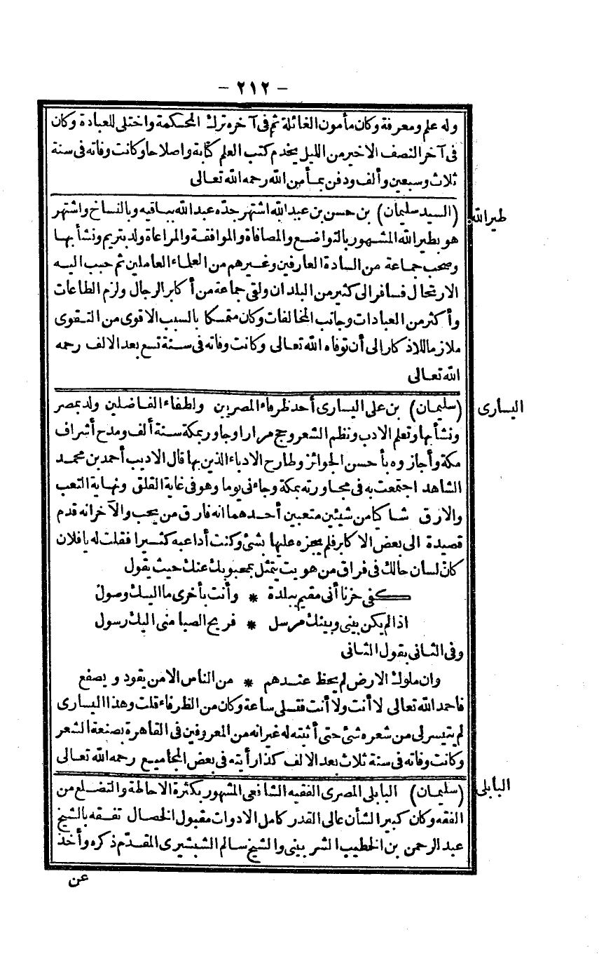 السَّيِّد سُلَيْمَان بن حسن بن عبيد الله اشْتهر جده عبد الله بباقيه وبالنساخ واشتهر هُوَ بطير الله الْمَشْهُور بالتواضع والمصافاة والموافقة والمراعاة ولد بتريم وَنَشَأ بهَا وَصَحب جمَاعَة من السَّادة العارفين وَغَيرهم من الْعلمَاء العاملين ثمَّ حبب إِلَيْهِ الارتحال فسافر إِلَى كثير من الْبلدَانِ وَلَقي جمَاعَة من أكَابِر الرِّجَال وَلزِمَ الطَّاعَات وَأكْثر من الْعِبَادَات وجانب المخالفات وَكَانَ متمسكاً بِالسَّبَبِ الْأَقْوَى من التَّقْوَى ملازماً للأذكار إِلَى أَن توفاه الله تَعَالَى وَكَانَت وَفَاته فِي سنة تسع بعد الْألف رَحمَه الله تَعَالَى
